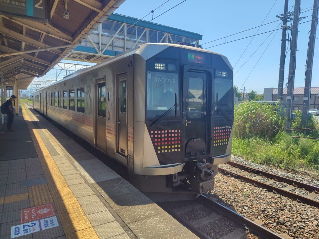 おはようございます。山形県沿岸部、庄内地方の余目駅に来ています。ここから少し北上して、庄内地方の中心都市の1つ、酒田市に行きます。余目からは15分ほど。12:09発の普通列車酒田行です。