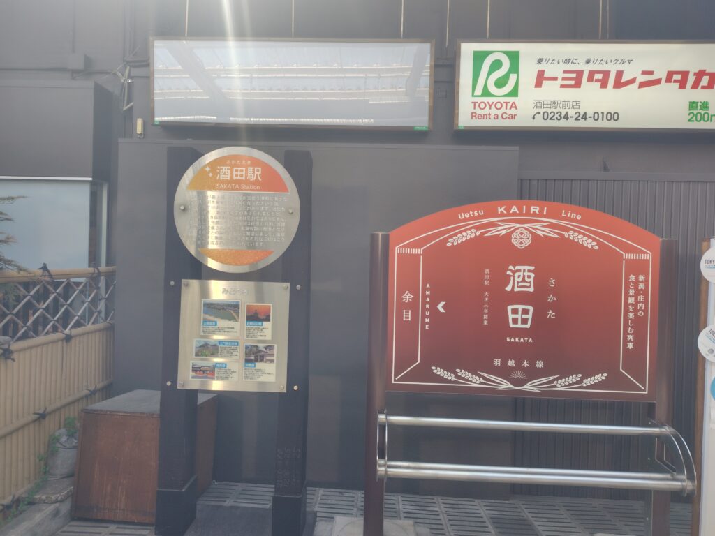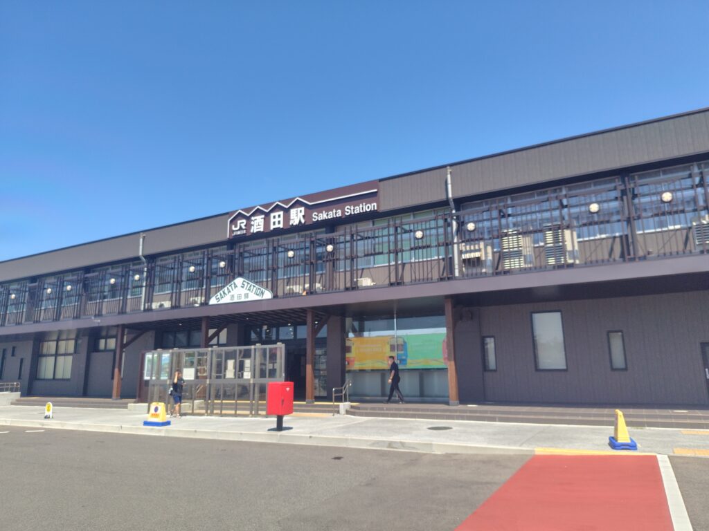 酒田駅の手前、東酒田を出てしばらくすると、急速に都市部に入ります。羽越線の全列車が停車し、特急の始発駅でもある、酒田駅です。新しい駅舎が目を惹きます。