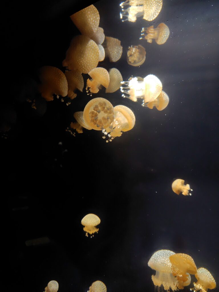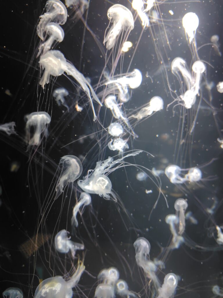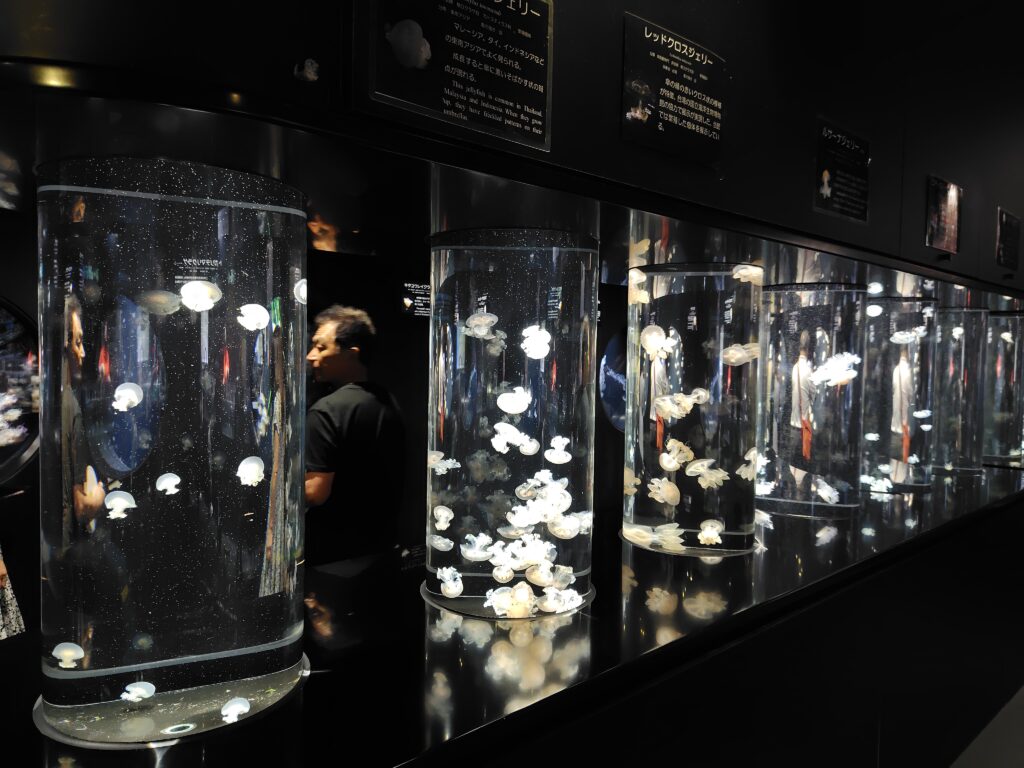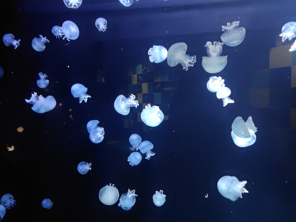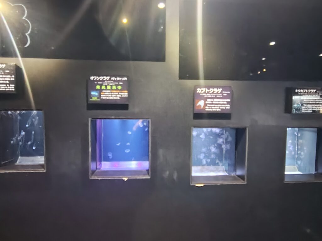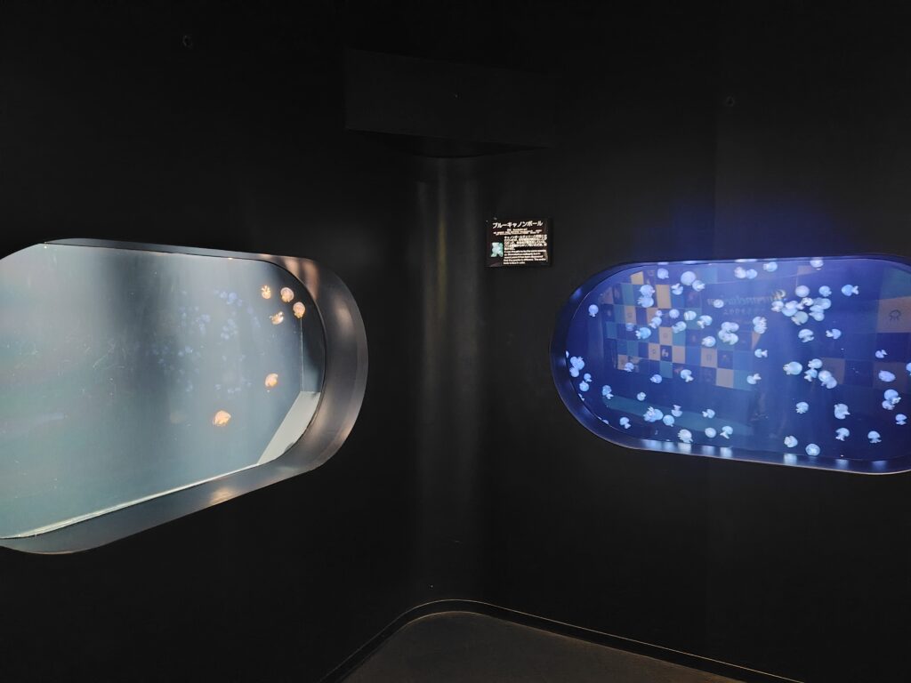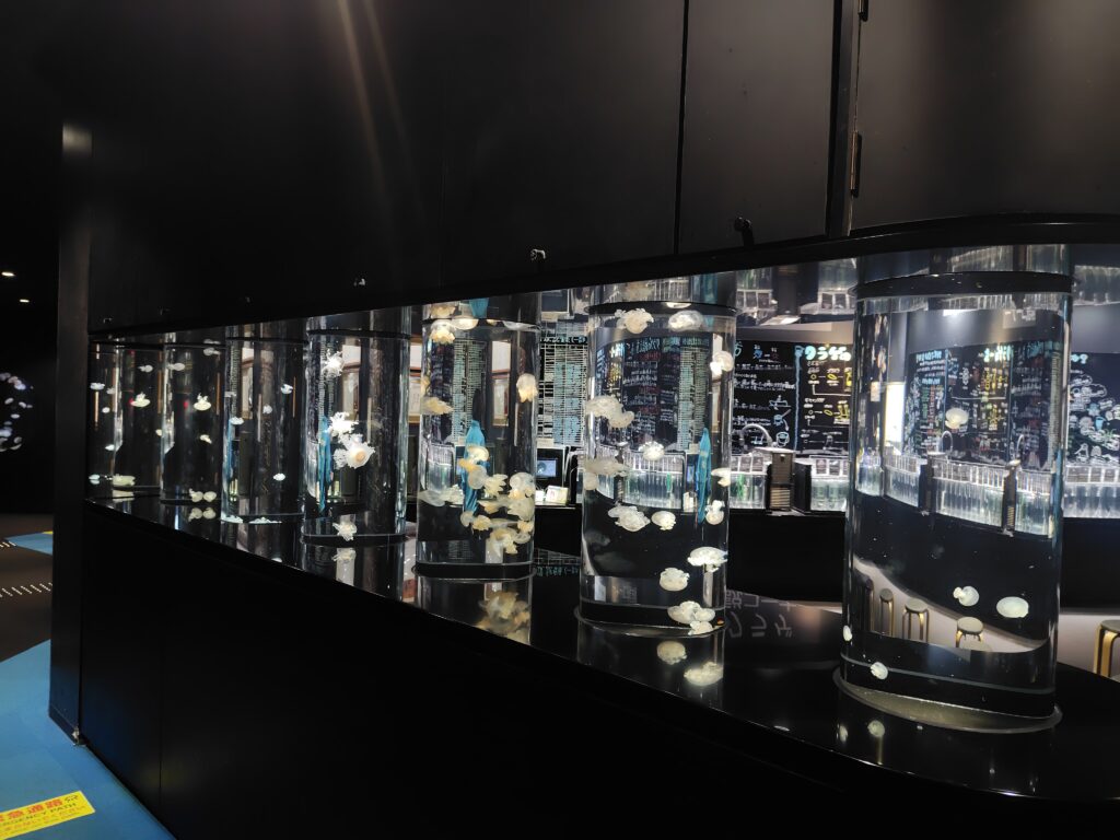 庄内の魚コーナーを抜けると、いよいよクラゲゾーンです。廊下のような長い空間にクラゲ水槽がずらっと並んでおり、そのすべてが異なる種類であるかと思うと圧巻です。