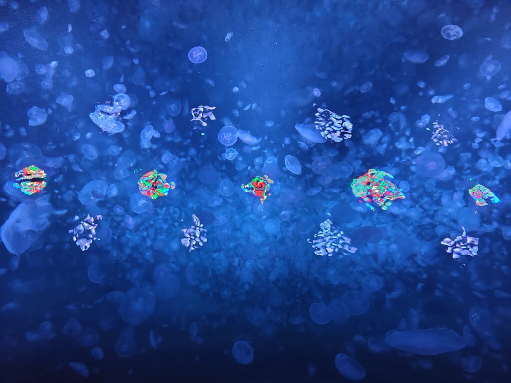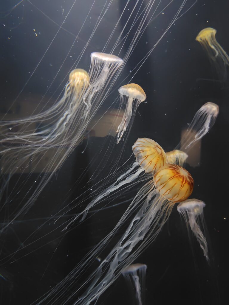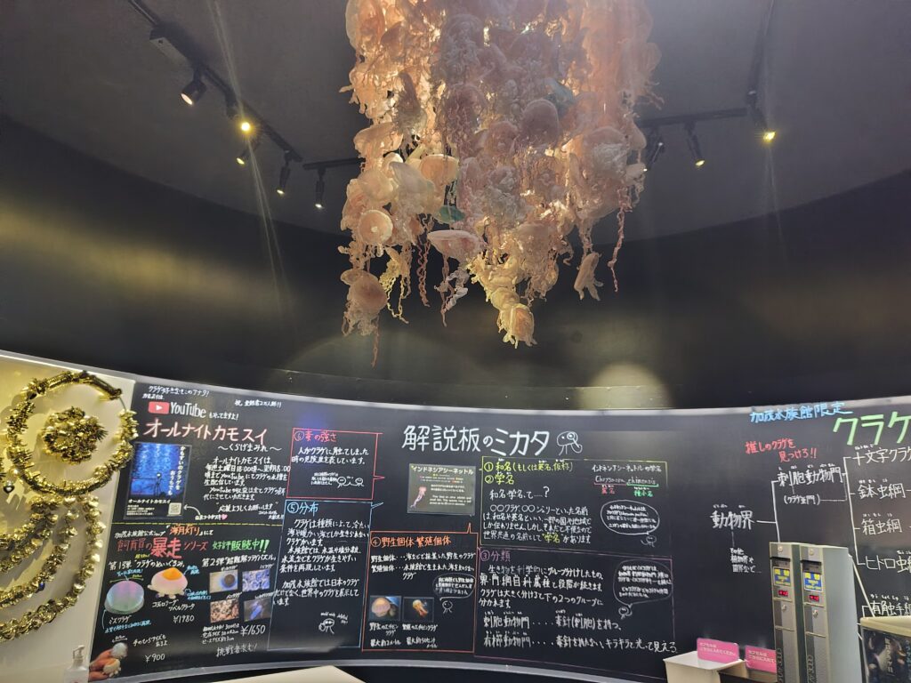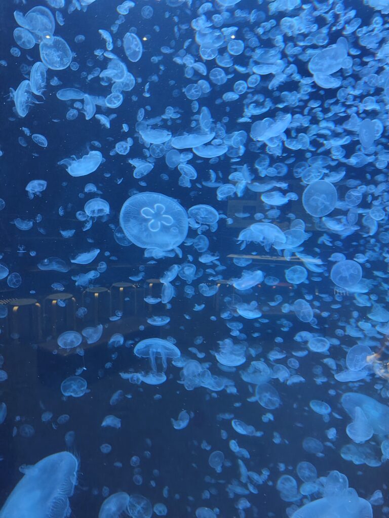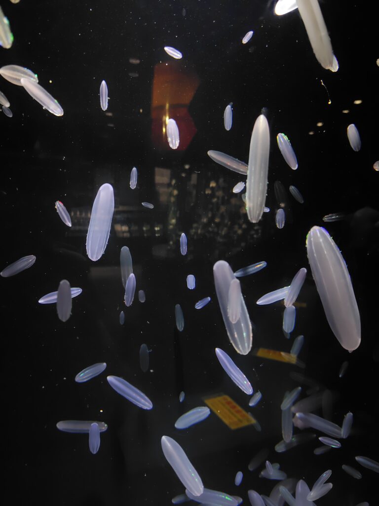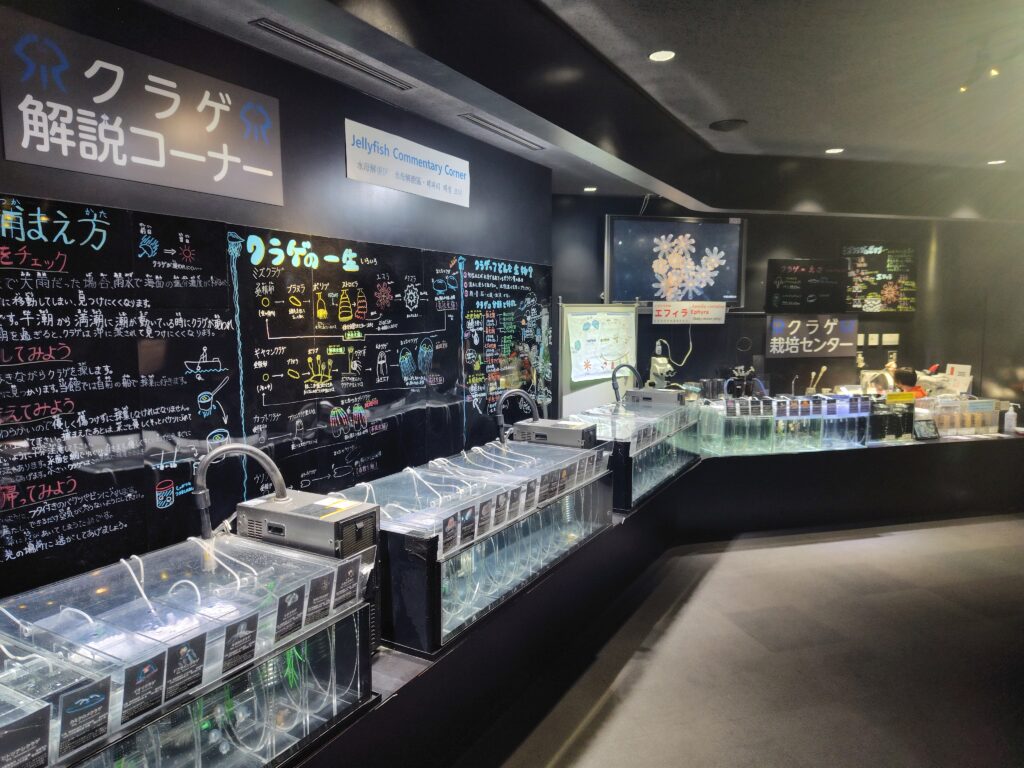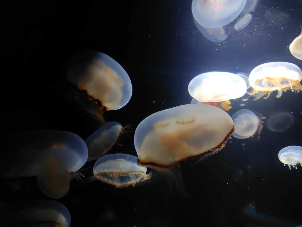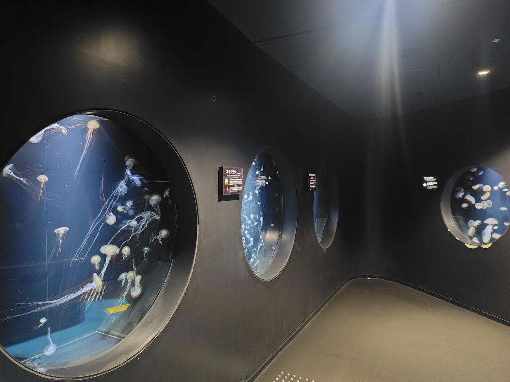 庄内の魚コーナーを抜けると、いよいよクラゲゾーンです。廊下のような長い空間にクラゲ水槽がずらっと並んでおり、そのすべてが異なる種類であるかと思うと圧巻です。