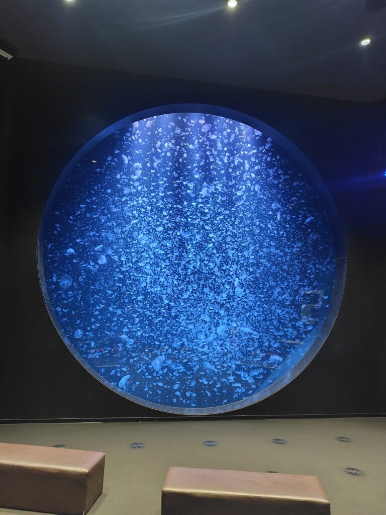 何匹ものクラゲがふわふわと漂う。そのような水槽がひたすらに続いていく。ここまで水槽の集合により幻想的な感じ得る水族館はそうないと思います。ここまででも十分感動モノなのですが、一番の目玉はこの先です。加茂水族館が誇る大水槽。しかし、他の水族館にあるような大水槽ではありません。約1万匹のミズクラゲが揺蕩う、直径5mほどの円形の水槽です。クラゲドリームシアターと呼ばれるこの水槽は息を飲むものがあり、ゆっくり見つめていると心が落ち着きます。