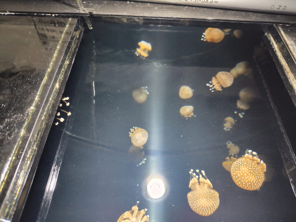 他にも海獣もいますが、館内自体はそこまで大きくはないです(小さくもないですが)。2周3周とクラゲを眺めて周回しながら、参加を申し込んだバックヤードツアーの時間を待ちます。参加料500円でバックヤードを巡ることが出来、迷うことなく申し込みました。バックヤードでは、数多くの水槽を上から覗くことが出来ました。それは小さいクラゲ水槽だけでなく、クラゲドリームシアターのもその上から見ることが出来ました。ふわりふわりと流れるクラゲを上から見るという滅多にない経験、貴重なものでした。他にも貴重な話も伺うことが出来、衝撃だったのは「クラゲを食べる」クラゲがいるということ。上から餌をやるので餌のメモがあるのですが、クラゲと書かれているのは興味深かったです。餌の確保方法も加茂水族館ならではで、長年の努力による賜物であろうと思えました。