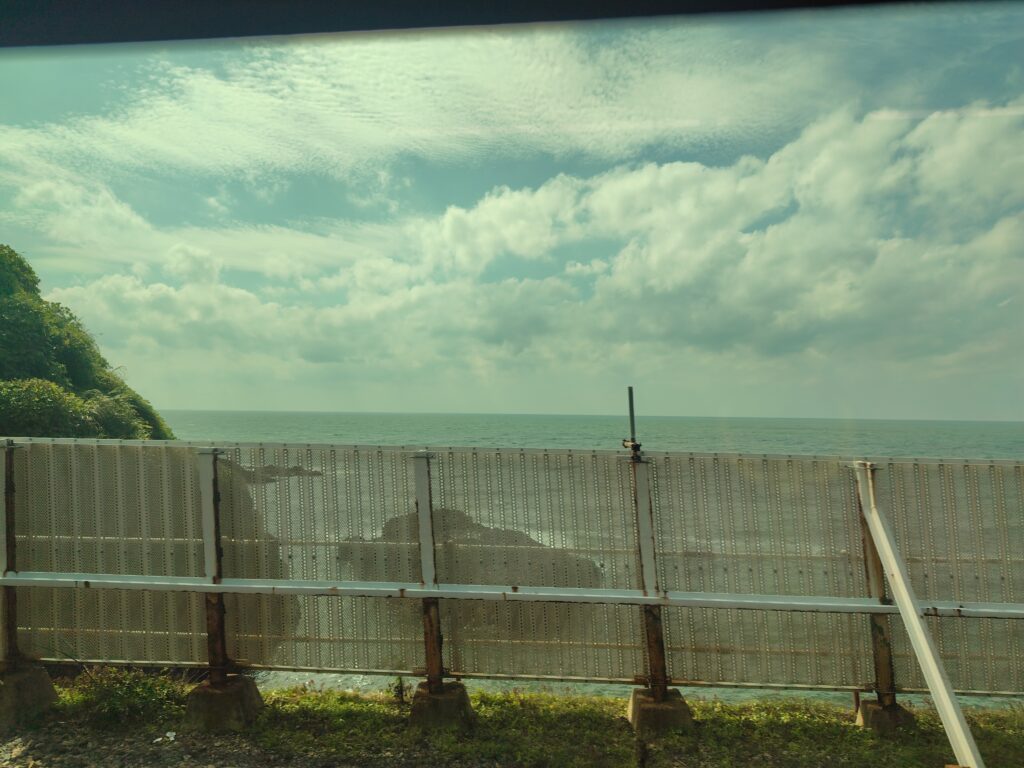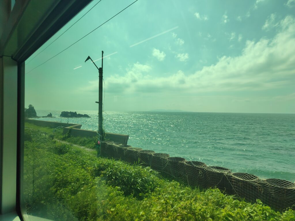 徐々に海に近づき、五十川(いらがわ)駅付近でいよいよ日本海が見えてきました。ここからはいよいよ絶景です。列車は基本的に左側を走行するため、今乗っている新津・新潟方面の列車は酒田・秋田方面の列車と比べて海から遠く、トンネルもより多くあります。そのため景色の面で下り列車には劣るとも言われますが、それでも絶景ではあります。