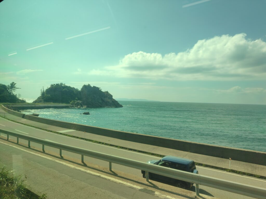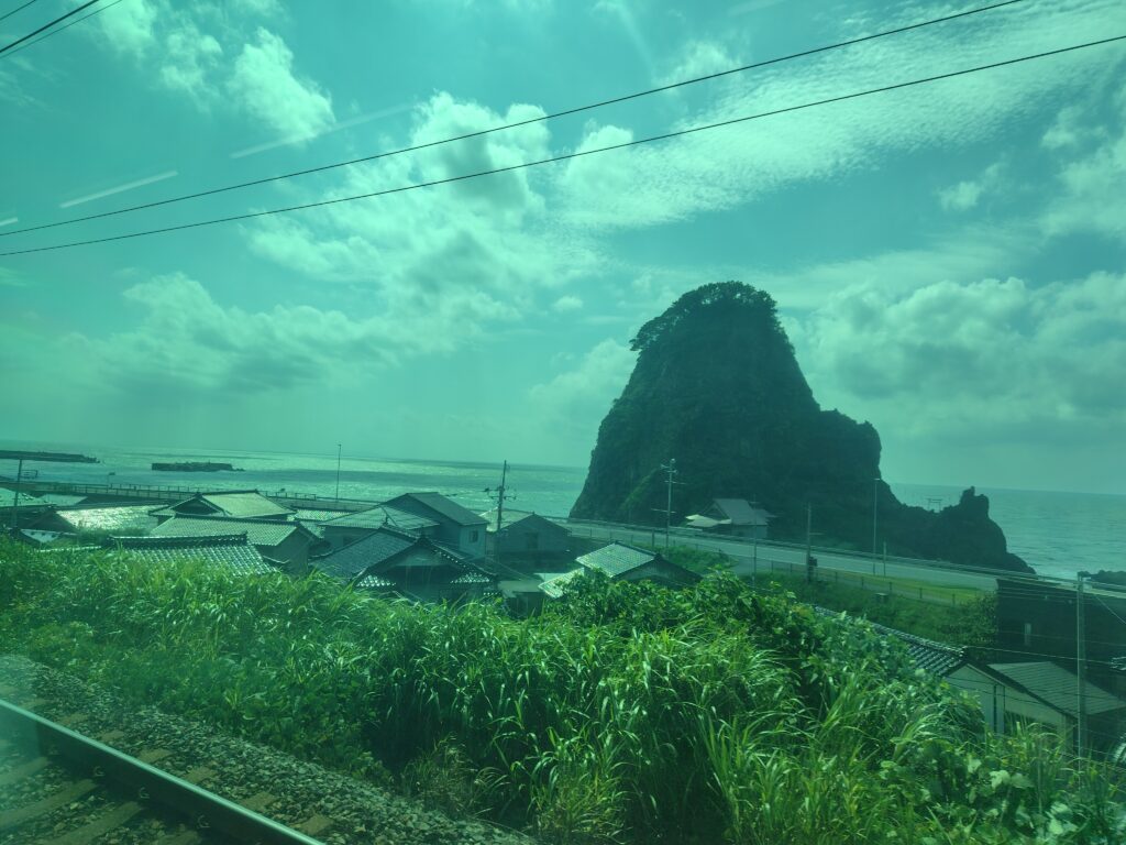 村上市北部の海岸は笹川流れという名前で親しまれ、景勝地としても人気です。そのエリアに入ってきました。桑川駅は笹川流れのアクセス駅の1つで、人で賑わっていました。また、村上市の対岸には粟島という島があり、うっすらとですが車窓からも島を見ることが出来ました。