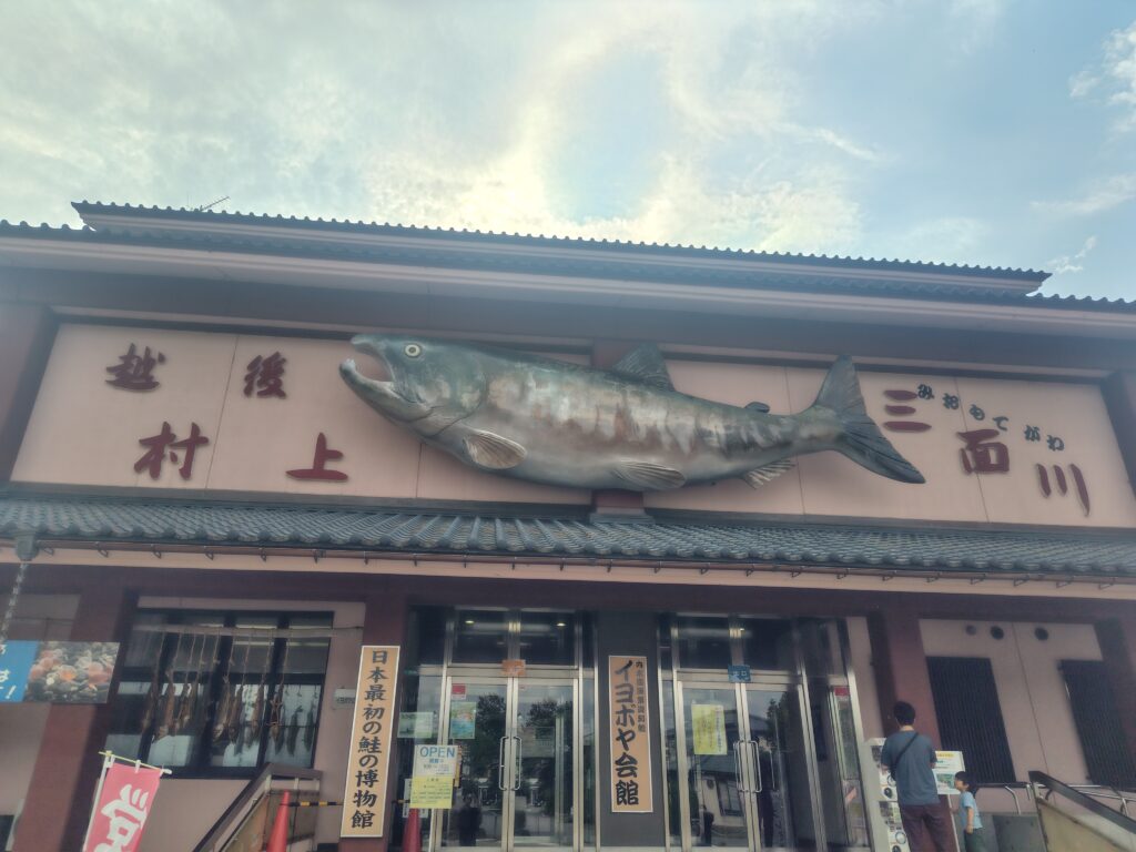さて、村上市も少し散策しようと思います。列車をあえて一本見送り、16:06発の列車に乗ろうと思います。というのも、村上市内で訪ねたいところがあるので、そこに行ってみます。その名も、イヨボヤ会館。一見するとよく分からない名前ですが、「イヨボヤ」とは村上の方言で、「鮭」を意味するそうです。村上と鮭文化の歴史を学べる博物館で、サケを展示する水族館的な側面もあります。簡単に行けるかと思い歩き始めましたが、片道なんと20分。村上市内に滞在できる時間が1時間10分ほどしかないので、イヨボヤ会館に滞在できる時間は2,30分。悲しいほどに短いですが、また再訪することを心に決め、簡単に見に行きます。
