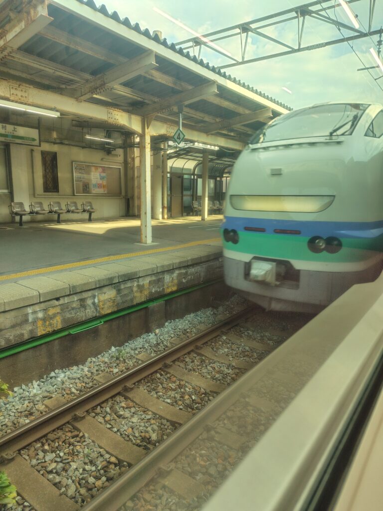 おはようございます。引き続き、羽越本線を南下しています。前回は村上市でした。イヨボヤ会館を見る時間を削ってまでして早い時間も列車に乗ったのには理由があります。ひとまず無事間に合ったので、乗り込みます。16:06発の新潟行。余裕をもって着くことが出来たので、特急いなほ号の発車を見ることが出来ました。