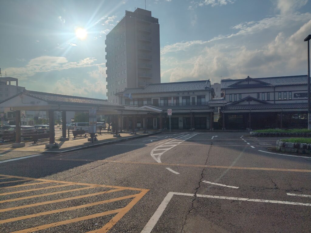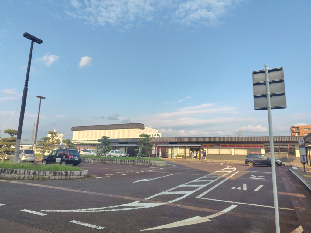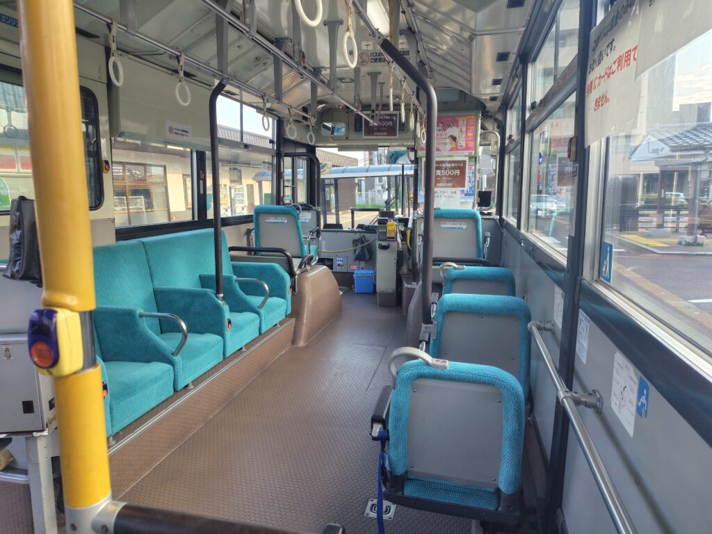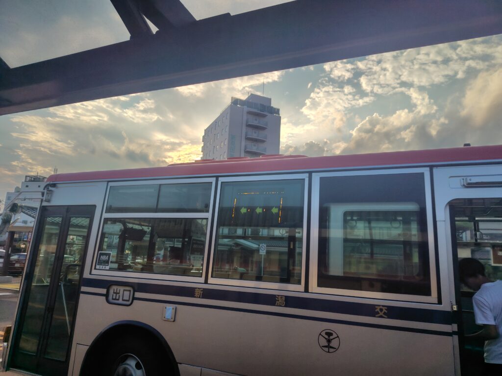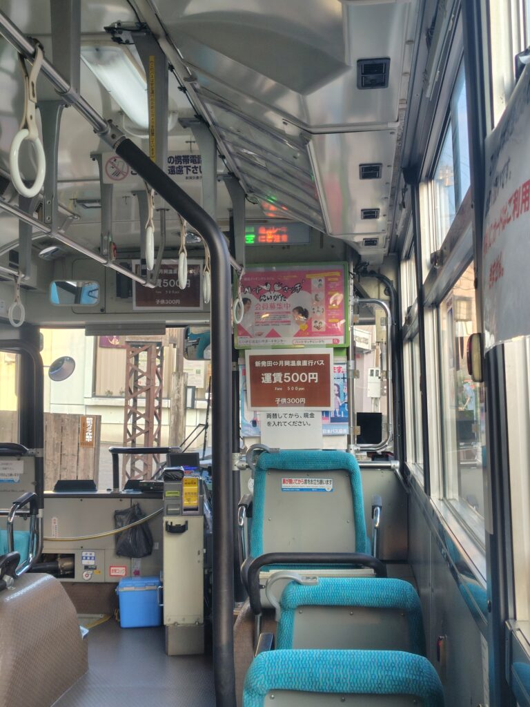 新潟市への通勤圏となる、新発田市です。その中心駅である新発田駅です。ここからバスに乗って本日最後の観光兼宿泊に行きます。新潟県を代表する温泉地、月岡温泉です。新潟交通が運行する月岡温泉直通バスに乗車します。新発田駅前17:15発で、運賃は500円です。大き目のバスが来ましたが、乗客は少なく車内は閑散としていました。
