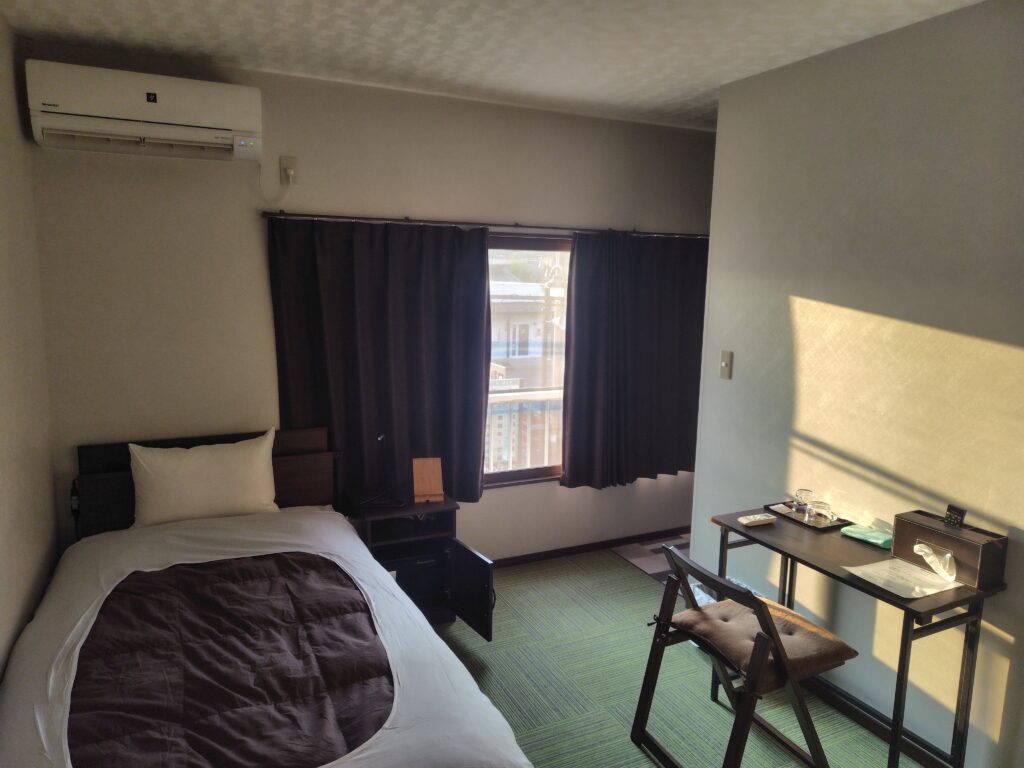 湯宿あかまつ さんという宿にお世話になります。このような温泉街で、一人部屋を用意して下さっているのは大変助かります。新しい建物で、室内も浴室もかなりキレイで良かったです。温泉は、脱衣所を出ると硫黄の香りが鼻腔をくすぐり、温泉欲を最大限に掻き立てます。屋内だと湯の緑色がよく分かり、良い入浴時間を過ごすことが出来ました。この日の夜と翌日の朝に浴場へ行ったのですが、どちらも他の人と会わず貸し切りでした。ありがたい反面、人があまり泊まっていないのではないかと少々心配になりました。まあ私が心配しても特に意味はないでしょうが。