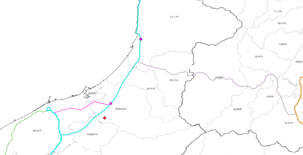 紫色:村上駅 桃色:新発田駅 赤色:月岡温泉