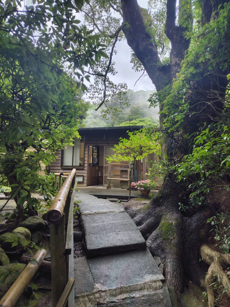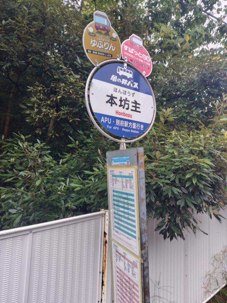別府駅前7:48発の、亀の井バス24系統 新港町経由のAPU行バスに乗車します。APUとは立命館アジア太平洋大学のことで、留学生と思しき方も見えました。バスに揺られること35分、10分ほど遅れて、本坊主バス停に到着です。地獄めぐりをするのですが、その前にずっと来たいと思っていた温泉に立ち寄ります。