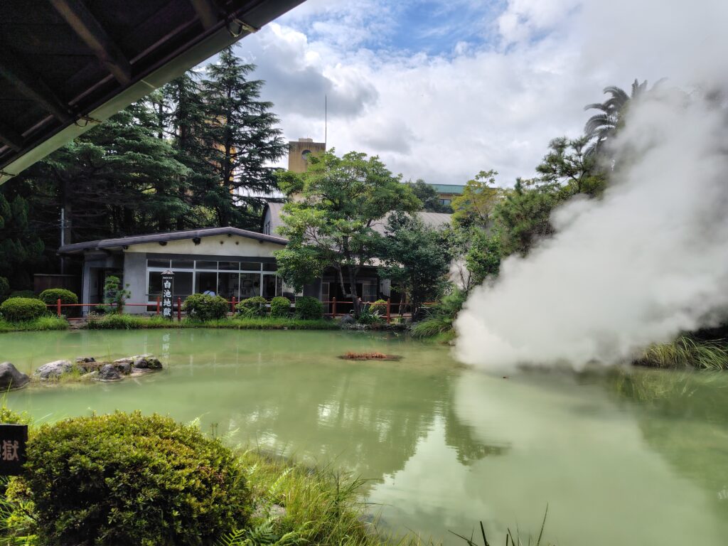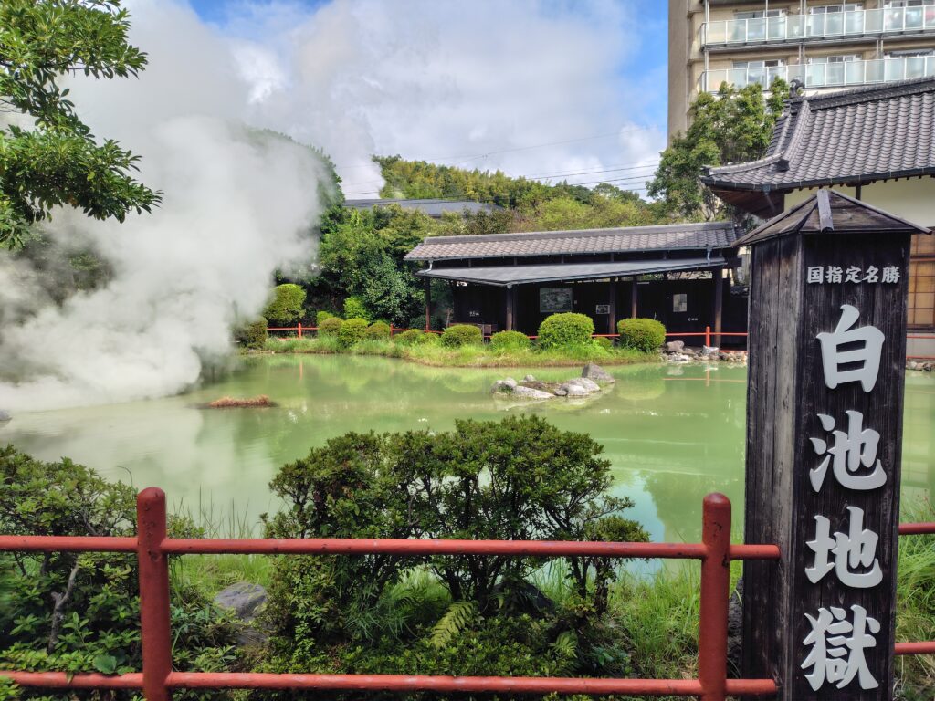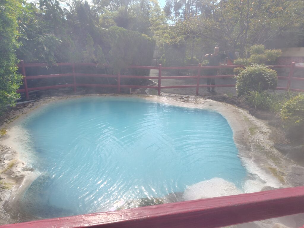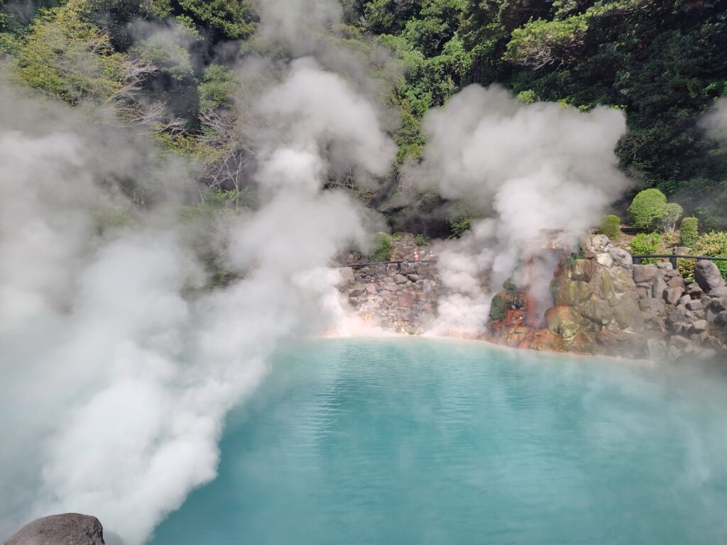 調べたところ、湯あたりにより怠く感じる方もいるそうですが、少し控えめにしたからかあまり感じなかったので、このまま地獄めぐりに向かおうと思います。少し下ったところに海地獄と鬼石坊主地獄という2つの地獄があります。ここでいう「地獄」は源泉で、さながらこの世のものではないような独特な景観が見られます。そんな地獄を7つめぐる、地獄めぐりが別府では人気なのです。7つが一括りでセット券なども発売されていますが、7つ以外にも地獄はあり、鉱泥温泉のすぐそばにも坊主地獄という地獄があります。時間的にまだ早かったので、またの機会とします。