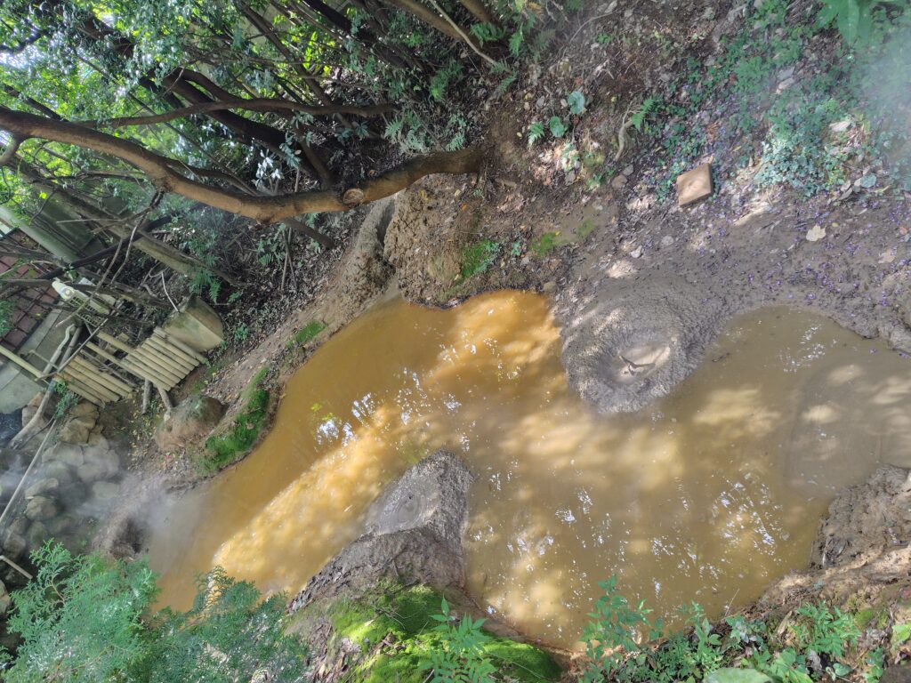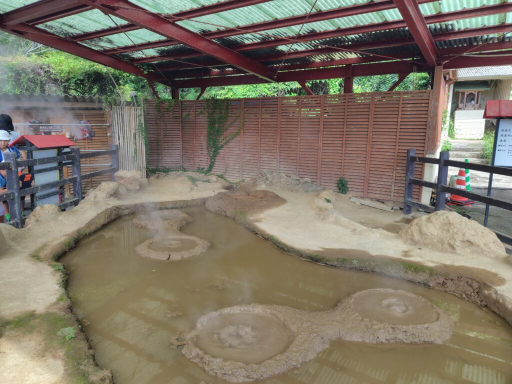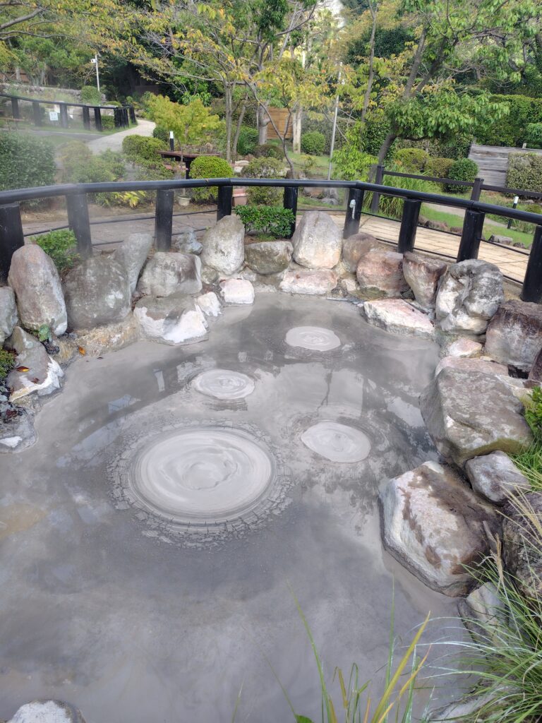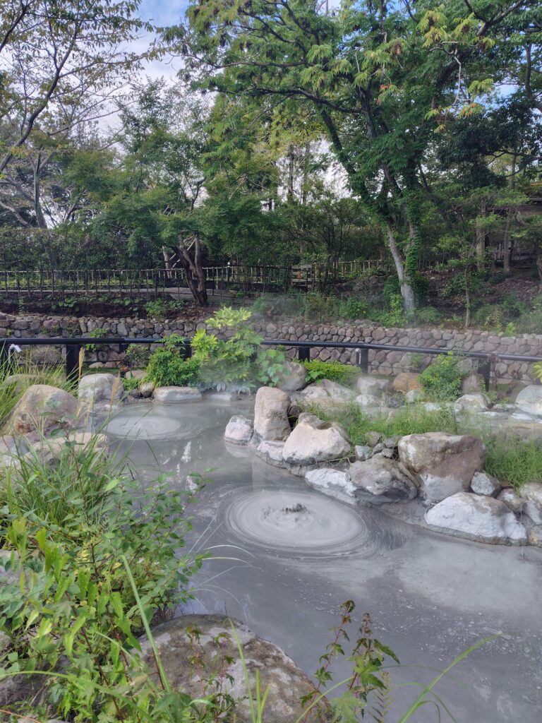 続いてすぐ隣にある鬼石坊主地獄です。灰色の泥のような水が、周期的に沸騰によりボコッと丸く膨らみます。その様子が坊主の頭のように見えるのが名前の由来で、海地獄と比べて人も少なく、ゆっくりと見ることが出来ました。