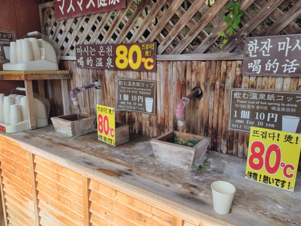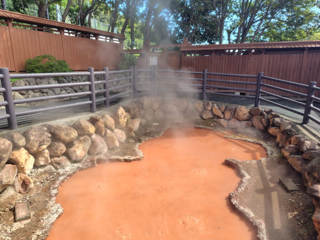 ここから5分ほど歩きます。続いての地獄は、かまど地獄。様々な色の湯があり、バリエーション豊富な地獄でした。校外学習かなにかで小学生くらいの子どもたちが来ており、賑わっていました。近いところでこんなに様々な湯が存在するのが驚きです。飲泉コーナーがあったので、頂きました。美味しくないことは無いですが、特別美味しくもない、温泉の味です。