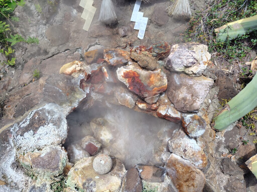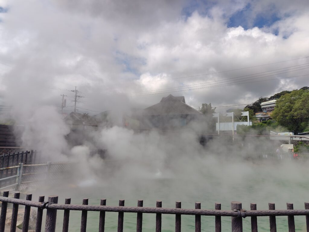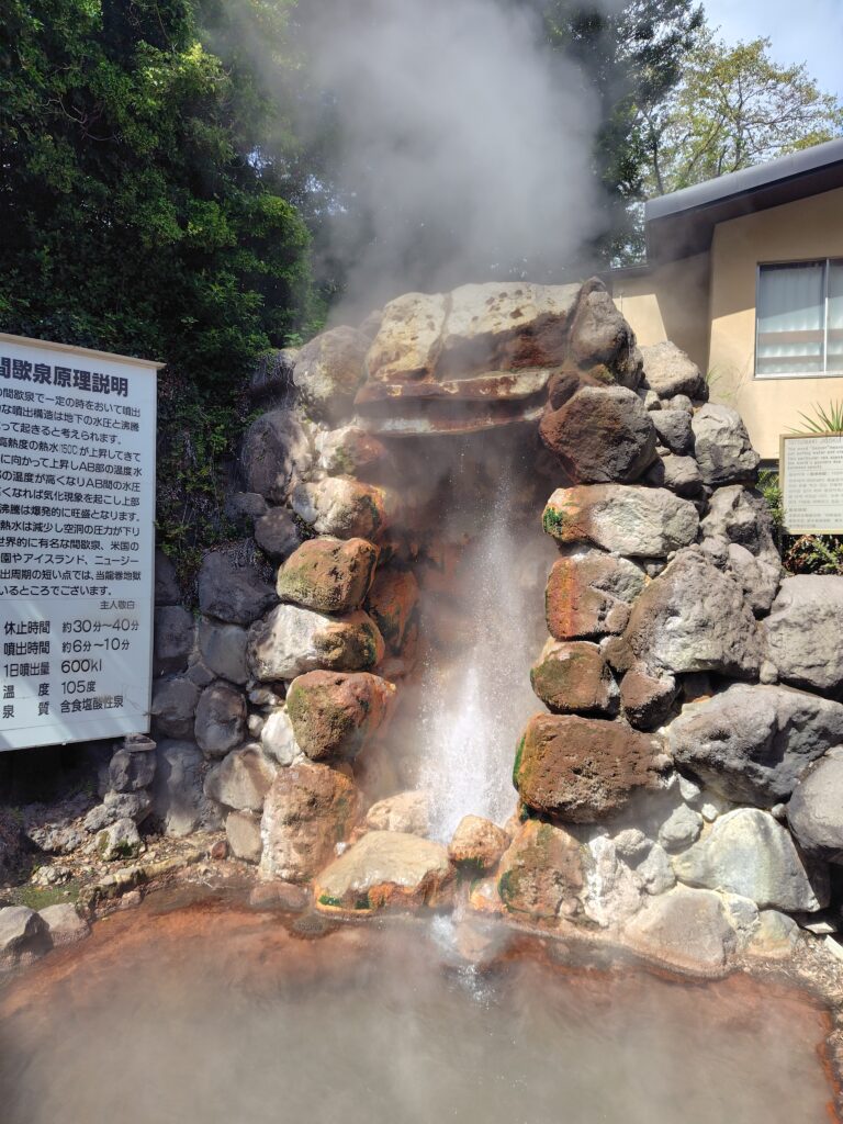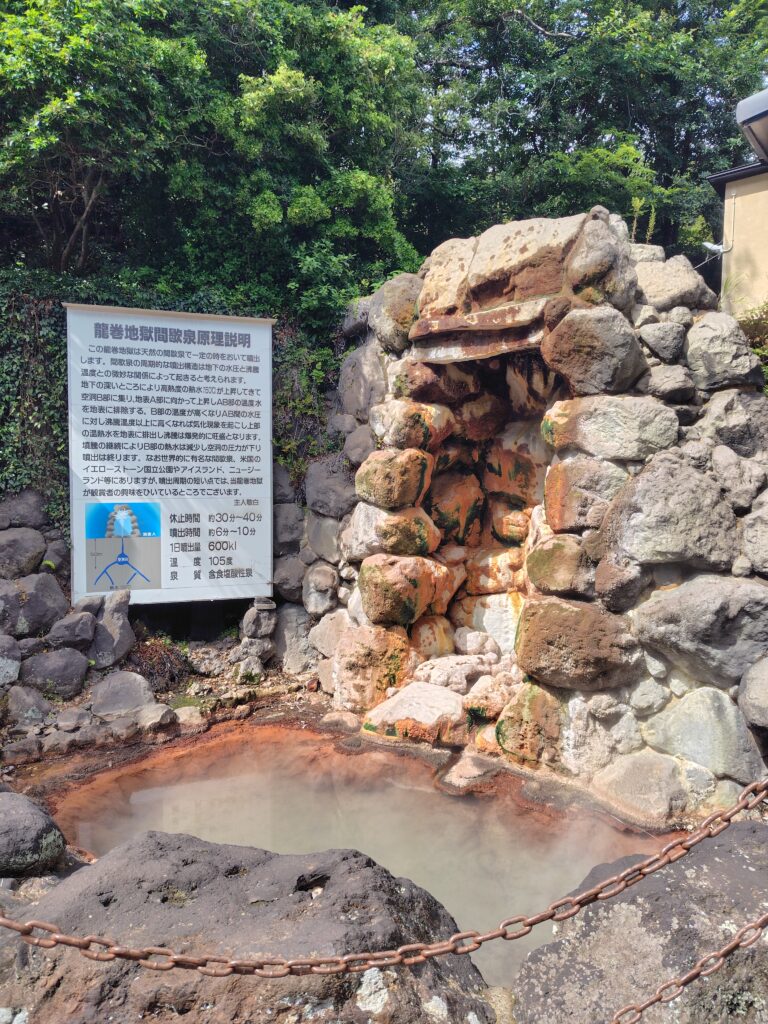 いよいよ最後、竜巻地獄です。血の池地獄のすぐ隣にあります。ここは間欠泉になっており、周期的に熱水が放出されます。運のよいことに、この地獄について5分ほど待つと間欠泉が噴出されました。これも自然の力で起こっていると考えると幻想的です。伊豆の土肥でも一度見たことがありますが、3,40分に一度という高頻度は国内はおろか世界的にも珍しいそうです。