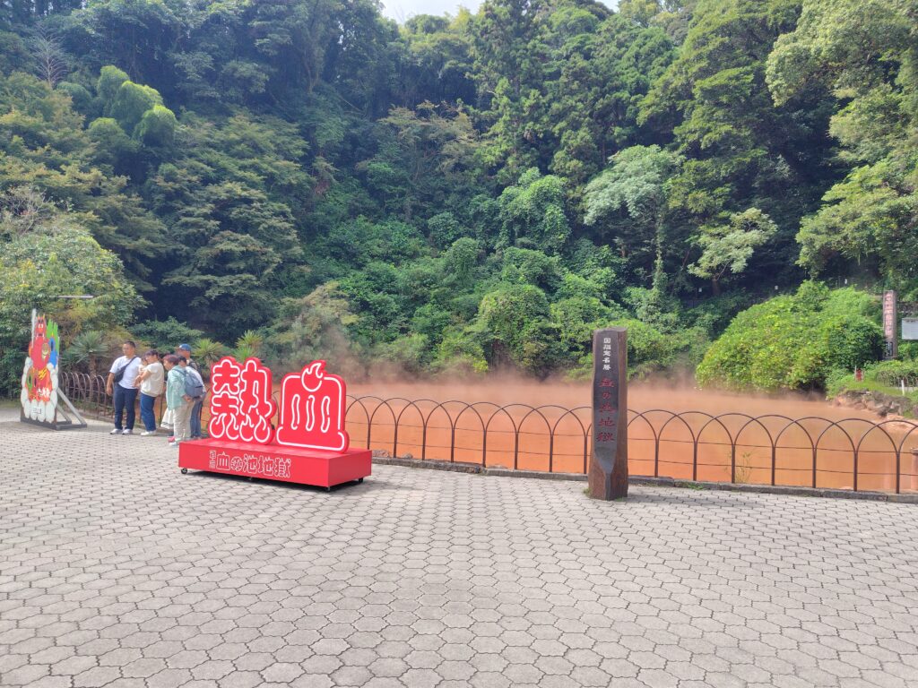 歩いた先にあるのは、血の池地獄。恐らくは別府の地獄の中でもかなり有名な部類でしょう。お土産コーナーを抜けると、真っ赤な池が登場。自然の力でここまで赤くなるのが不思議でなりません。海地獄と同レベルの有名な地獄ですが、鉄輪などからも距離があるので人はそこまで多くありませんでした。