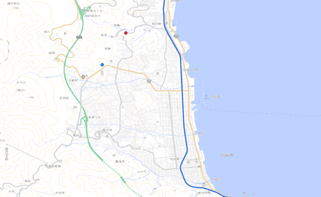 灰色:鉱泥温泉 青色:海地獄 赤色:血の池地獄