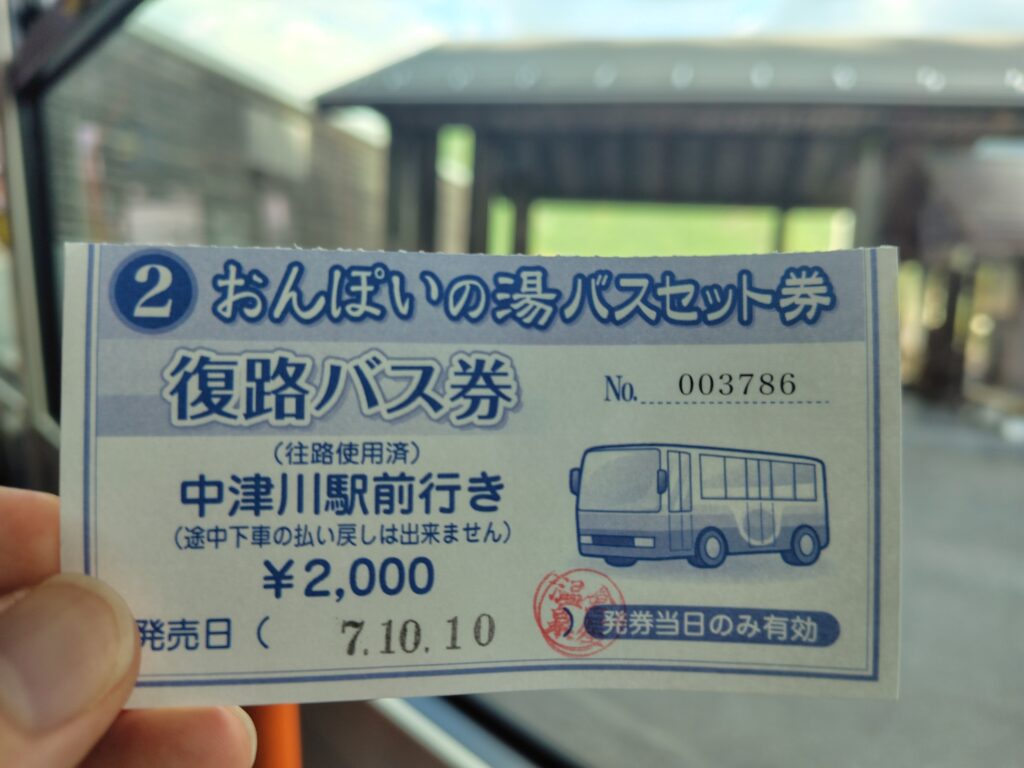 このバスにもお得なきっぷが存在します。おんぽいの湯バスセット券(外部サイト)というものを利用します。中津川駅前から付知峡倉屋温泉までのバス往復券に加えて温泉の入浴券もセットになり、お値段2000円。この区間のバス片道料金が1290円なので、もはや乗るだけでお得です。入浴量は800円で、合計すると1000円以上お得になります。バスに乗り込み運転手さんにこのきっぷを使用したい旨を伝えると、降りておんぽいの湯の受付で伝えてくれとのことでした。