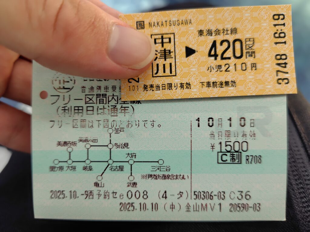 中央線で簡単に行けるとはいうものの、1時間以上かかり、運賃も1340円とそれなりにします。そこで、わずかではありますがお安く中津川まで往復する方法をまずご紹介します。使うのは、名古屋おでかけきっぷ(外部サイト)です。JR東海の名古屋周辺の路線が1日乗り放題になる企画乗車券で、1500円で購入可能です。残念ながらこのきっぷだけで中津川駅に行くことは出来ず、中央線での有効区間は名古屋ー釜戸です。そのため釜戸で一度降り、釜戸ー中津川間をICで入場すると、少しだけ安く行くことが出来ます。釜戸ー中津川間は420円で、この区間の往復とおでかけきっぷを合計すると2340円。普通に往復するよりも340円安いです。