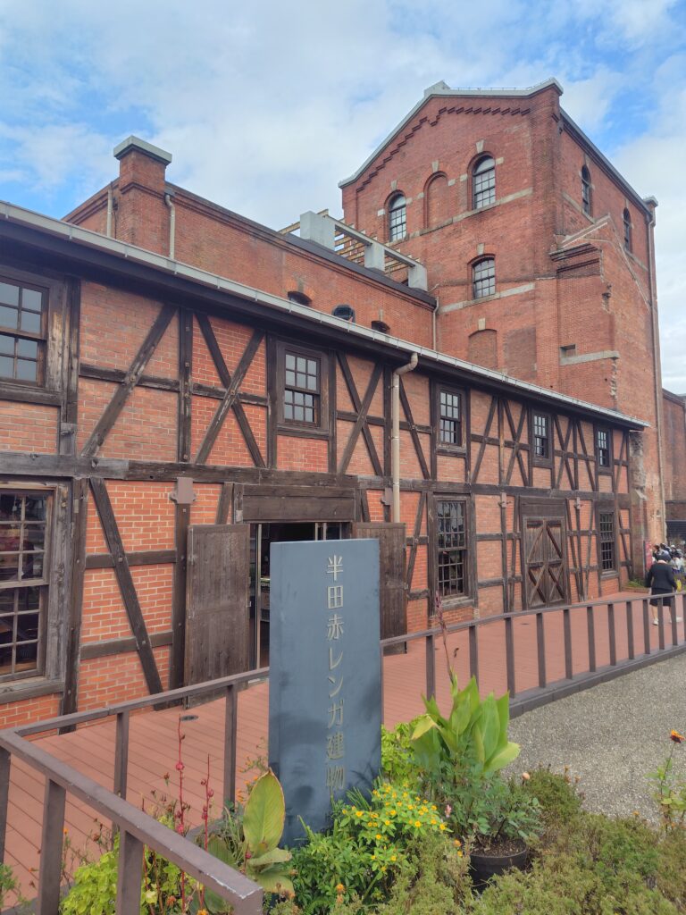 半田駅から北西へ歩き進めます。まず訪ねるのは、半田赤レンガ建物です。時代を感じる、味のある見た目の建物です。ビール工場として作られたのが始まりだそうで、カブトビールというブランドのビールがここで生まれたようです。