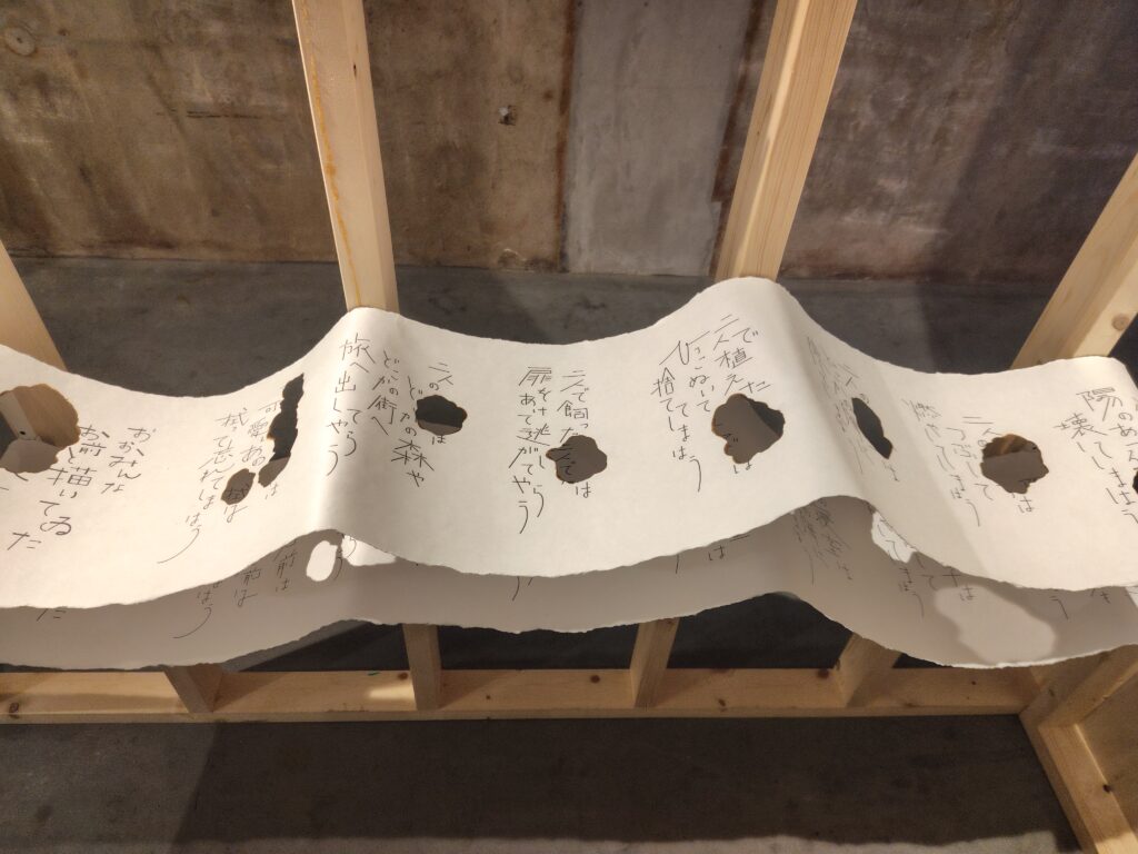 奥にある展示は、新美南吉の言葉と風景展。ごんぎつねの作者として知られる新美南吉は、ここ半田で生まれ育ったそうです。かなり芸術的な展示だったので難しいものも少なくなかったです。個人的には、「去り行く人に」という詩が、穴の開いた紙に書かれている展示がとても良かったです。
