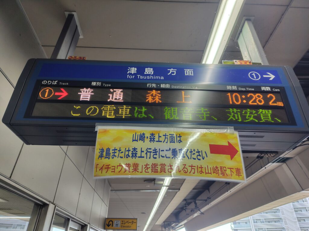 名鉄一宮駅は、名古屋や岐阜、豊橋とつながる名古屋本線の他に、尾西線という路線が走っています。長い路線ではないですが、全線を乗り通すには2回の乗換が必須という変わった路線です。ここ一宮からは津島駅まで行くことが出来ます。ただ、今回乗車するのは、途中の森上止まり。ですが、森上駅の一駅手前、山崎駅で下車するので問題ありません。
