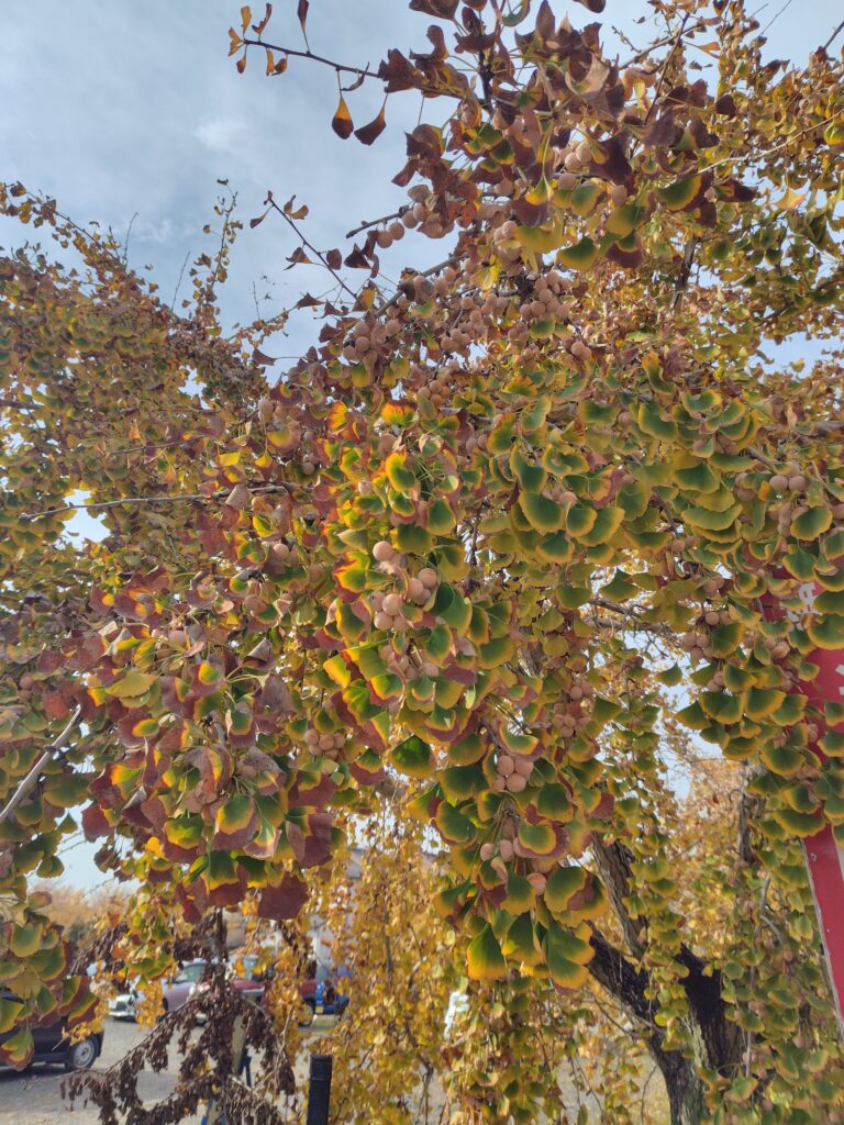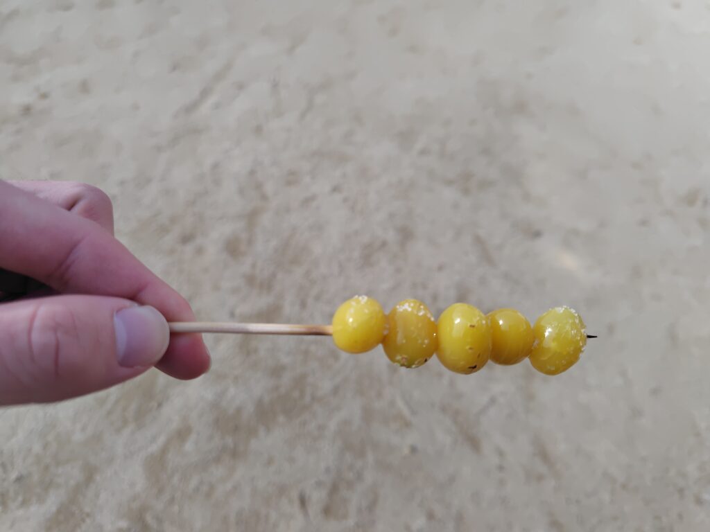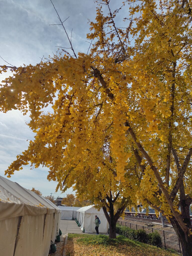 丁度この前の土日まで、お祭りが行われていたそうです。その名残で、出店がまだ少し残っていました。せっかくなので銀杏を頂こうと思い、銀杏串を注文。殻を割り素揚げしたものを串に通し、焼いて塩をかけて頂く料理。銀杏を始めて頂いたのですが、クセもなく、焼き立ての香ばしさや塩が引き立てる遠くにある甘さが絶品でした。人もそこまで多くなく、ゆっくり出来ました。黄葉のシーズンは終わりかけでしたが、それでも多くの木が見られ、楽しめました。