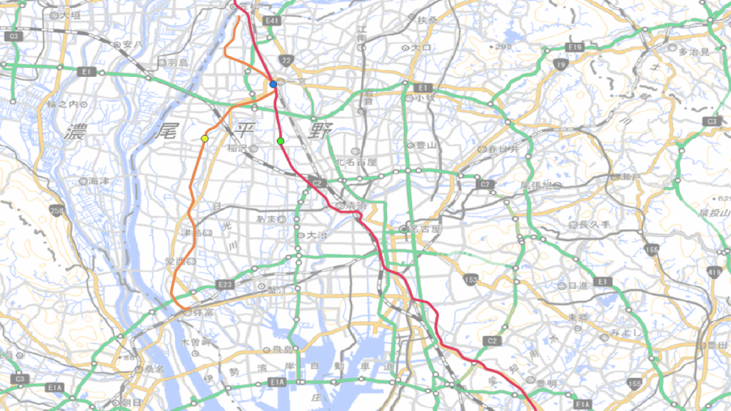 青色:名鉄一宮駅 緑色:国府宮駅