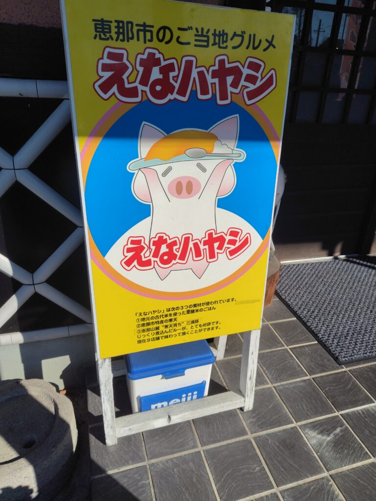 入浴を終えたのでご飯を頂こうと思います。ささゆりの湯内の食事処で頂くのもよいと思ったのですが、恵那市のご当地グルメを知ったのでそちらを頂きに車を走らせます。恵那市のグルメ、えなハヤシ。地元の豚や古代米、寒天を使用したハヤシライスです。ハヤシライスの語源となったという説もある早矢仕有的さんのゆかりの地区がここ恵那市だそうです。岩村藩の医者として勤めた有的さんが、患者に振る舞った料理がハヤシライスの起源とされているとも言われているようです。