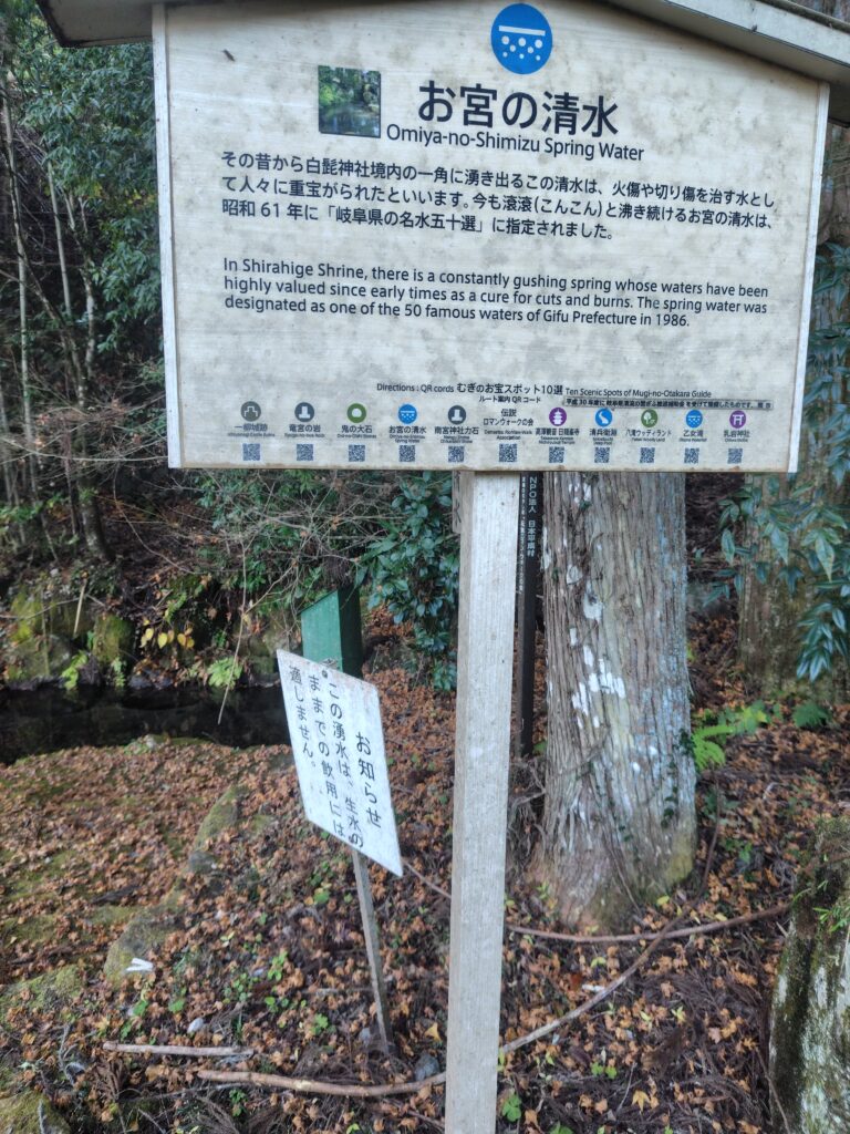 最後に、少し時間があったので近くの気になったところに行ってみます。お宮の清水という湧水地。岐阜県の名水100選に選ばれているスポットです。これは白髭神社という神社の境内にありました。こちらの神社は時が止まったような雰囲気。悪く言えば寂れてしまっていますが、山奥の静かな神社ということで、霊験あらたかな様子を肌で感じます。