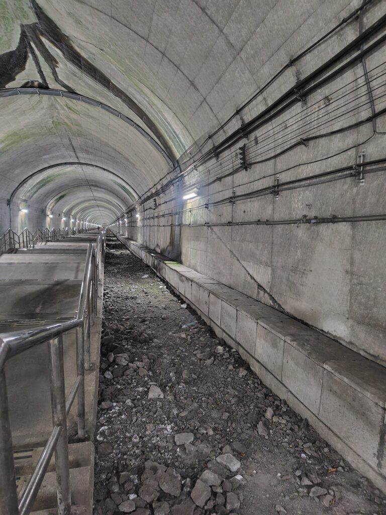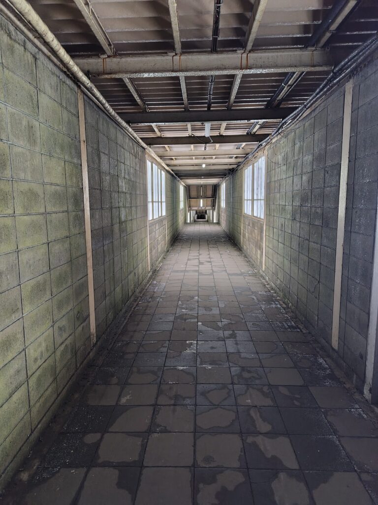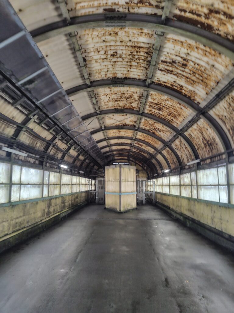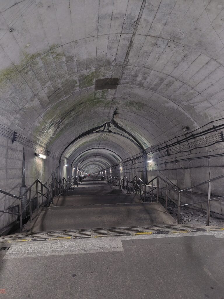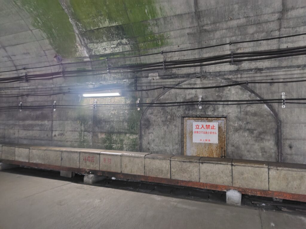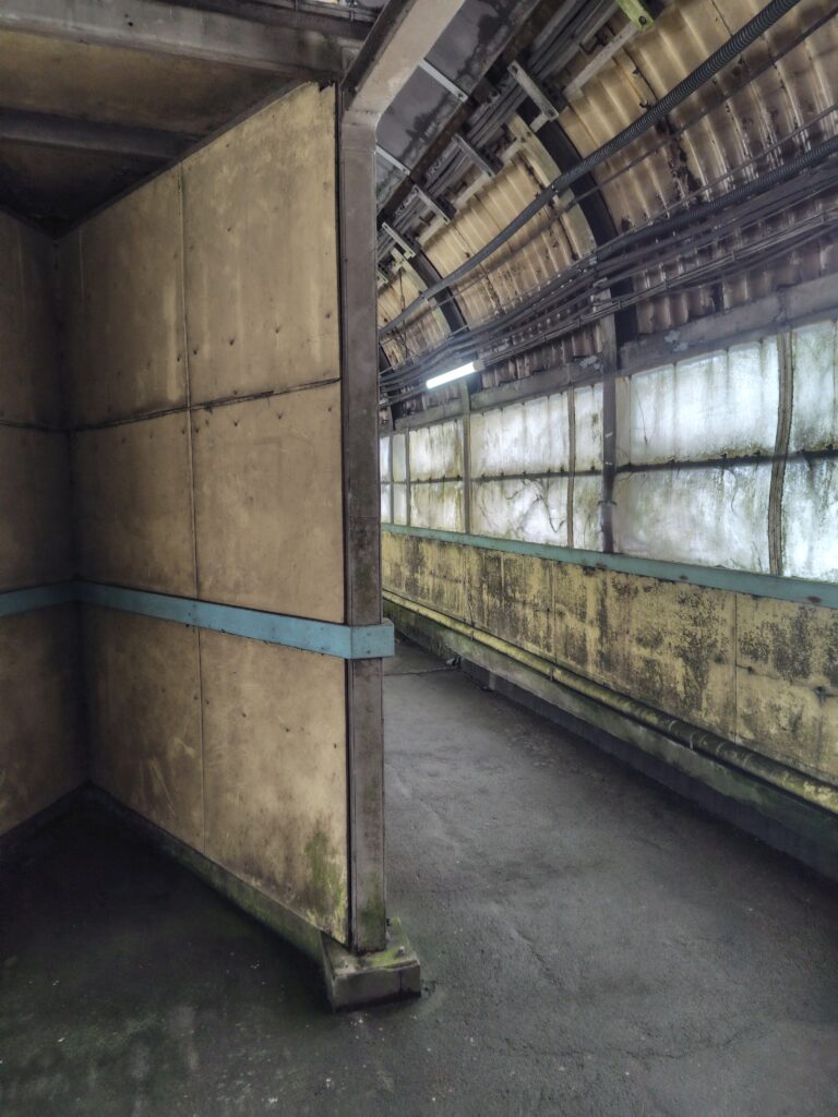 改札を越え、左に向かいます。改札を越えてからホームまでは10分ほどかかるそう。長い廊下が続き、おどろおどろしい扉が現れました。この廊下の部分が、恐らく駅前から見えた、川に架かる橋の部分なのでしょう。