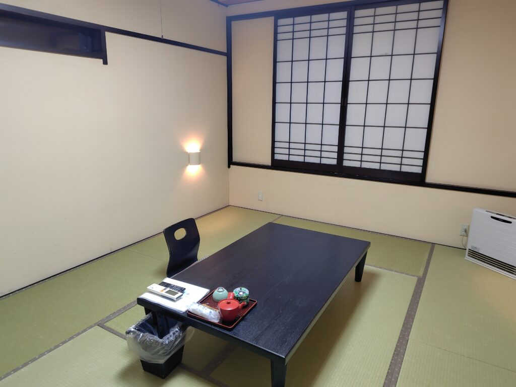 一人では勿体ないくらいの広い部屋に通して頂きました。時期が時期で、他の宿泊者を見かけることもなかったので、こんないい部屋に入れてもらえたのかもしれません。とても丁寧に女将さんが手続きや説明をして頂き、一息ついたのち、さっそく温泉に向かいます。塩化物泉で、キレイに管理された温泉でした。汗が出てくる熱いお湯で、雪で冷えた身体にピッタリです。2度ほど温泉に入り、お酒を飲んで寝ました。