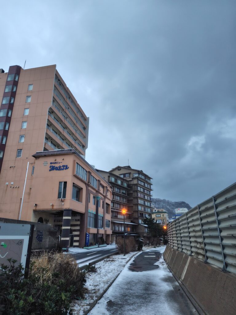 次の日、明るくなったので温泉街を歩いてみました。大きなホテルもあり、温泉街の雰囲気があります。思えば、海に近い温泉街は泊まったことがなかったと思いました。ぐるっと街を見て回ったあと、冷えた身体を再び温泉で温め、チェックアウトします。