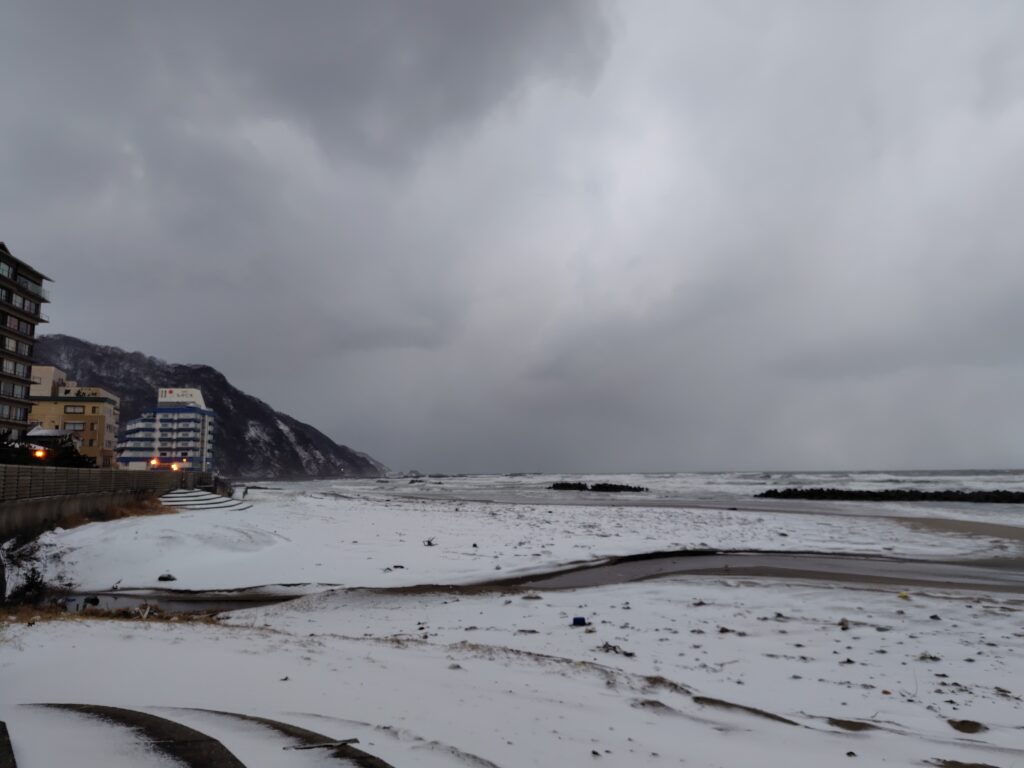 加茂水族館は沿岸にあります。外はかなり暗くなってきていますが、荒々しい日本海を見ることが出来ます。16:52 海水浴場というバス停に到着。温泉街の端に位置し、今回泊まる宿はこのバス停近くです。