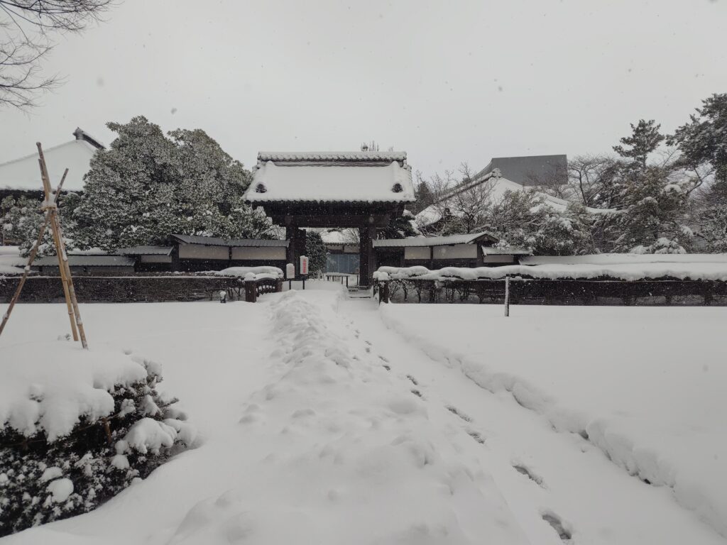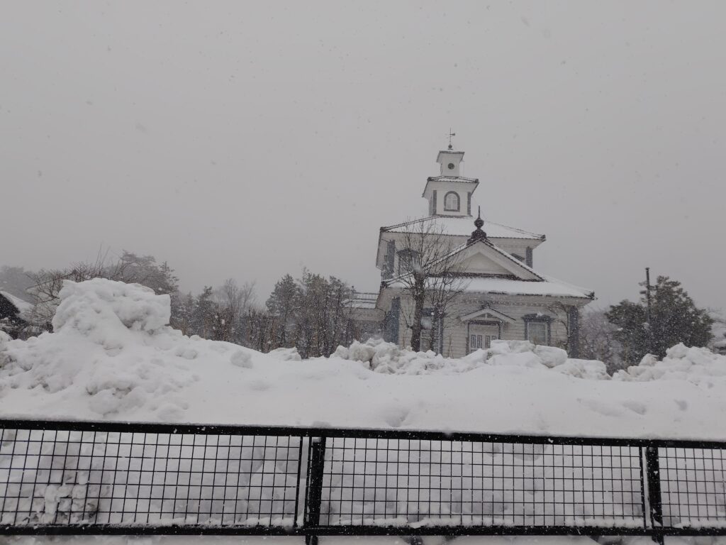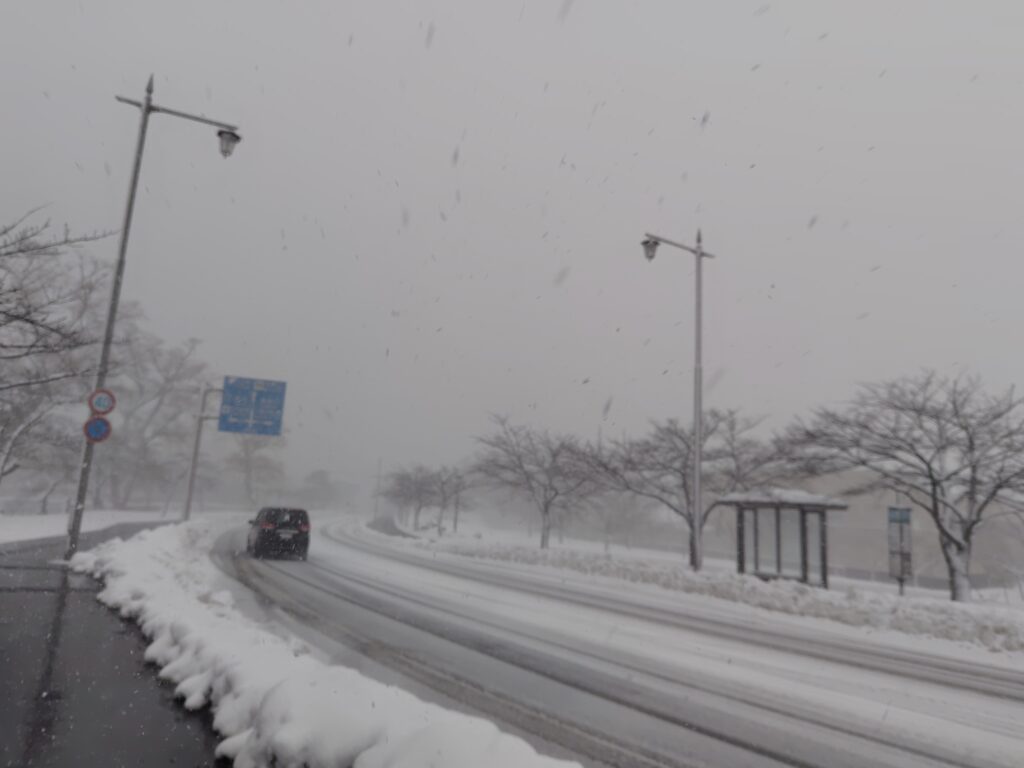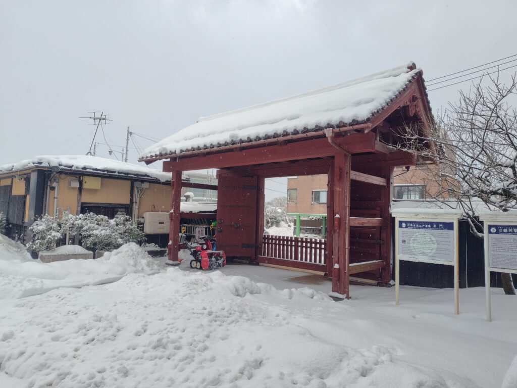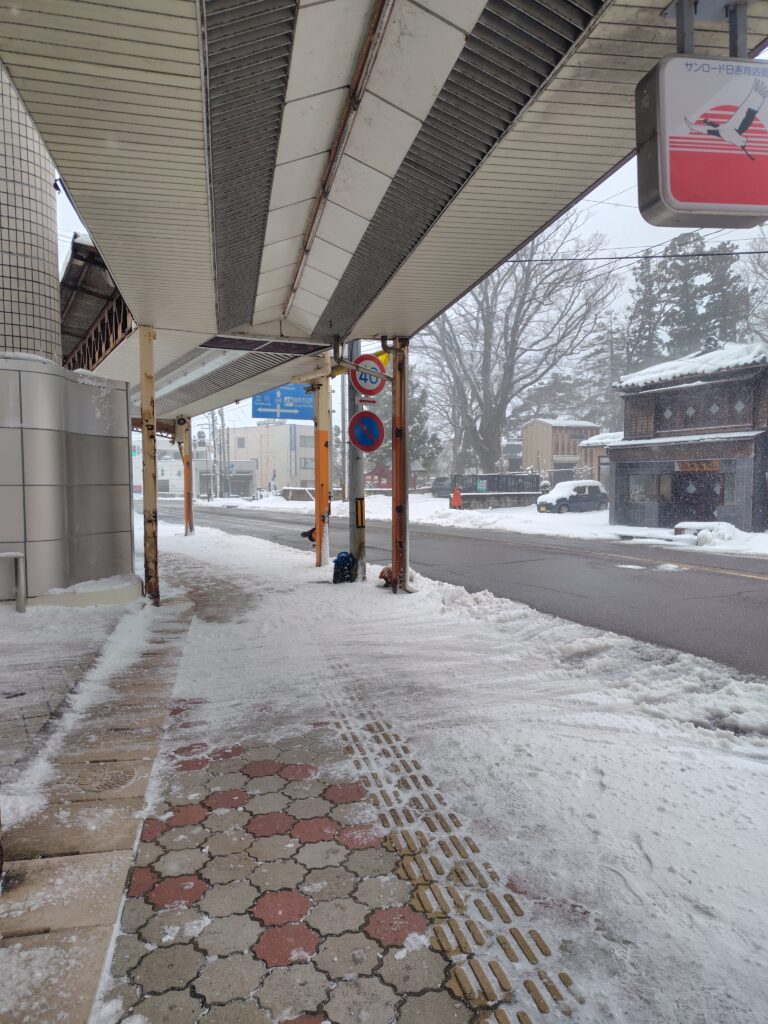 海水浴場バス停8:22発のバスに乗り、鶴岡市街に戻ります。バスに揺られている間も雪は強く降り、到着したころがピークでした。5分ほど遅れて、8:58に致道博物館バス停到着です。