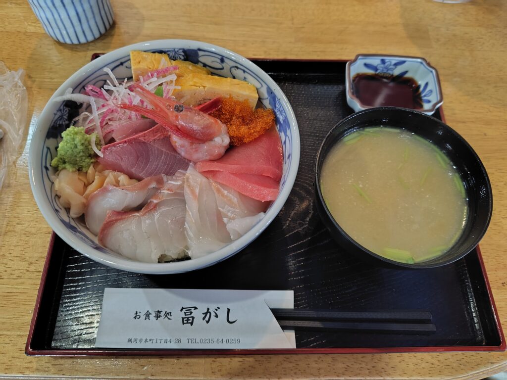 さて、最後に鶴岡市内でお昼を頂いて、移動したいと思います。日本海側といえば、やはり海鮮。市街地に良さそうなお店を見つけたので行ってみます。銀座通りというアーケード近くに位置する、冨がし さん。具材たっぷりの海戦丼が人気で、見栄え良し味良しで最高でした。