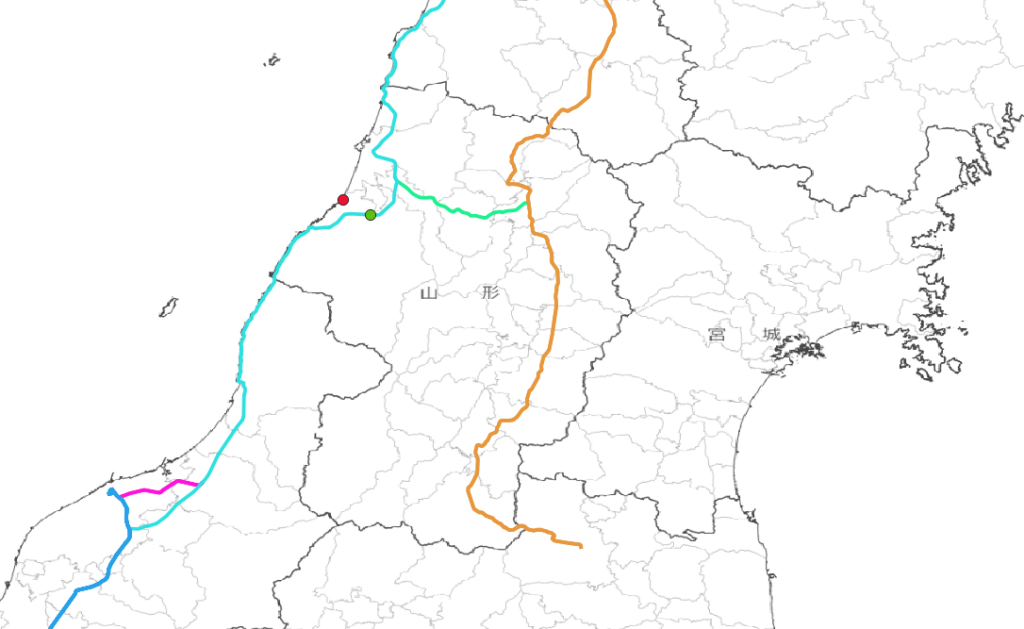 橙色:奥羽本線 黄緑色:陸羽西線