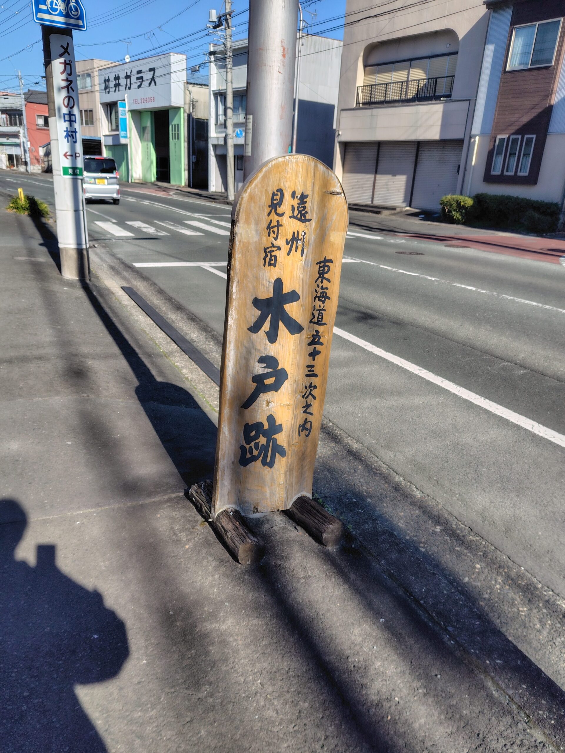 更に北上します。磐田駅から歩いてきた道は、旧東海道であったそうで、県道413号線を越えると、宿場の跡であることを伝える看板も見られました。次の信号を右折すると、見付宿の中心部です。そして、左には、姫街道という別の街道が分岐していきます。正式には本坂通と言うこの街道は、ここ見付と、現在の愛知県豊川市にあたる御油宿とを、浜名湖の北側を経由して結ぶ街道です。起点も終点も異なるものの、現在の天浜線のようなルートになります。今でこそ簡単に越えられますが、かつての東海道は、浜名湖を越えるのに大変苦労したそうです。今切の渡しと呼ばれる難所が舞阪宿と新居宿との間(現在の弁天島駅周辺)にありました。その上、新居宿には関所が併設され、特に女性の通行が厳しく制限されたそう。そのような背景から、新居を避けて浜名湖北岸を迂回ルートに使った女性が多かったことから、姫街道という名前が付いたという説もあるそう。見付は国府が置かれただけではなく、交通の要衝でもあったようですね。宿場町は後で訪問することにして、ひとまず昼食を頂きに行きます。