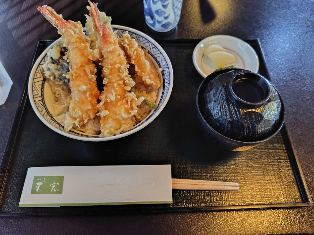 市立図書館を越えると、目指していたお店に到着。味匠 天宏 さん。旧宿場町からは少し距離があるものの、当時の雰囲気を感じさせる、古民家のような立ち振る舞い。期待が高まります。席に通して頂き、タッチパネルを確認すると、カレーという文字は1つもありません。今日はやっていないのかと少し残念になりつつも、天丼があまりに美味しそうなので注文。提供された豪華なそれを見れば残念なんて気持ちは吹き飛びました。サクサクの衣にぷりっぷりの海老。タレも甘辛く絶妙で、天ぷらの味を引き立てていました。絶品の天丼です。なお、お会計時におもろカレーについて尋ねたところ、今はもうやっていないとのこと。悲しいですが、そのお陰でこんなに美味しい天丼と巡り会えたと思うと、良かったのかもしれません。おもろカレーリベンジもしたいですが磐田にきたらまた天丼も食べなければと思えるお店でした。