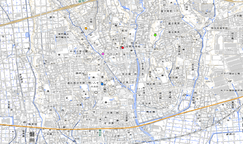 青色:遠江国八幡宮 桃色:姫街道 起点