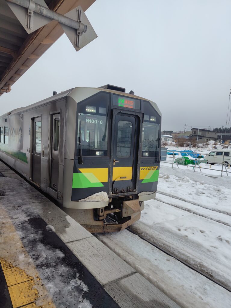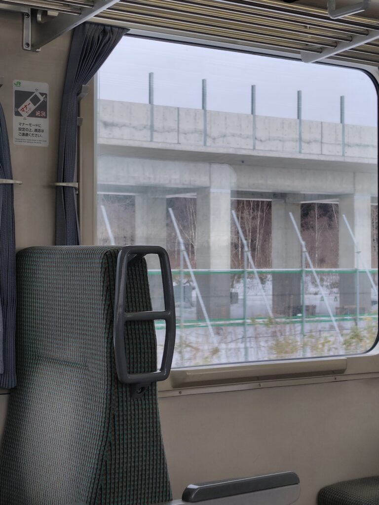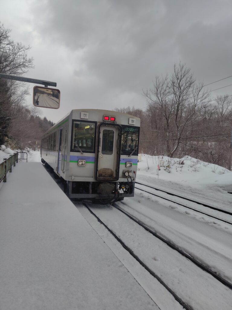 ようやく良い時間になりました。駅に戻り、函館線の旅を続けます。1両編成の普通列車 倶知安行。ニセコや倶知安などの需要から、車内は思いのほか混んでいます。とはいえ、乗るのは一駅だけ。ゆっくりと列車は走り、二股駅に到着。