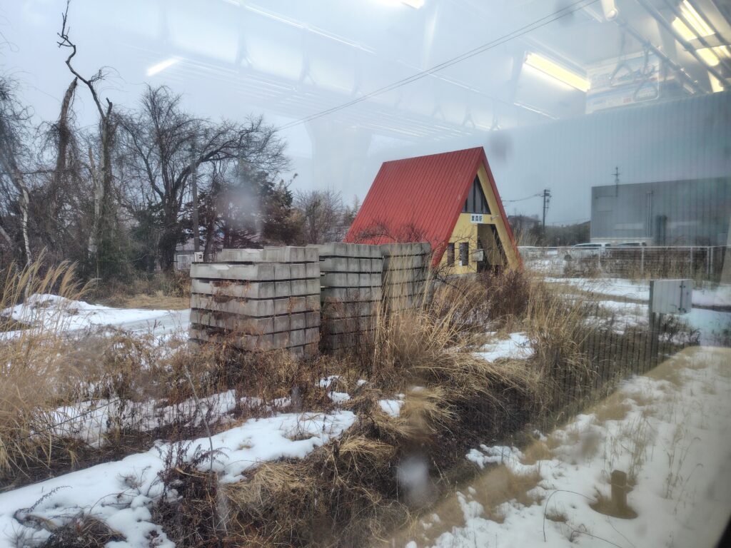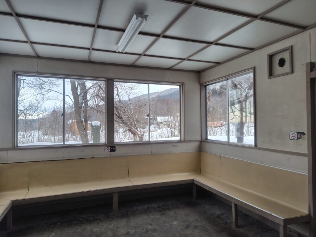 駅に積もったホームを見ると、私以外に誰も使用していないことが分かります。さて、次の列車は1時間後。駅舎や周辺をゆっくり見ていこうと思います。駅周辺はなにもありません。正確には温泉とヴィラがありましたが、やっているのかも不明。