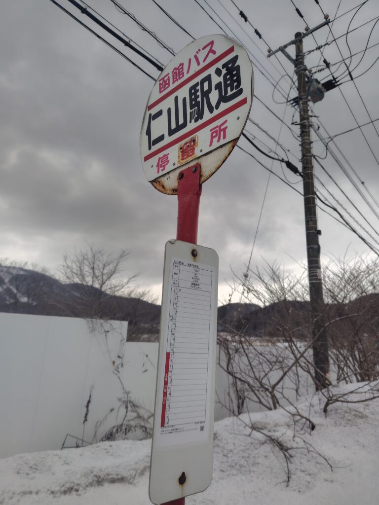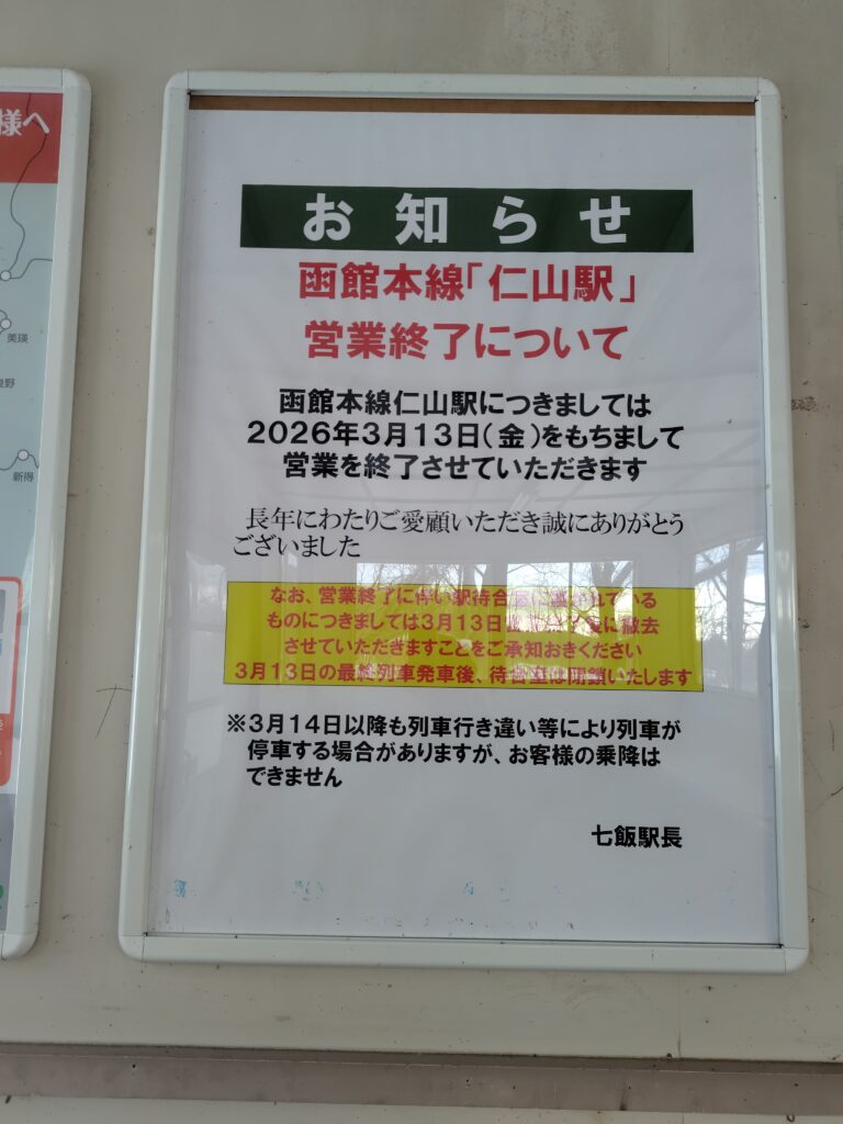札幌のベッドタウンとしても人気の七飯を抜け、新幹線乗換駅である新函館北斗駅を出ると、次の駅が1つ目の目的地、仁山駅。新幹線駅の隣駅が廃止というのも、少々驚きです。7:53着。廃止前なのでだれか降りるかと思いましたが、私意外には誰も降りず。