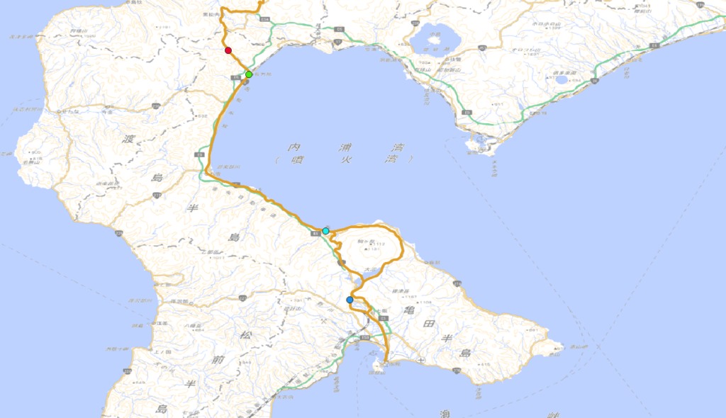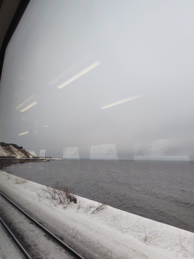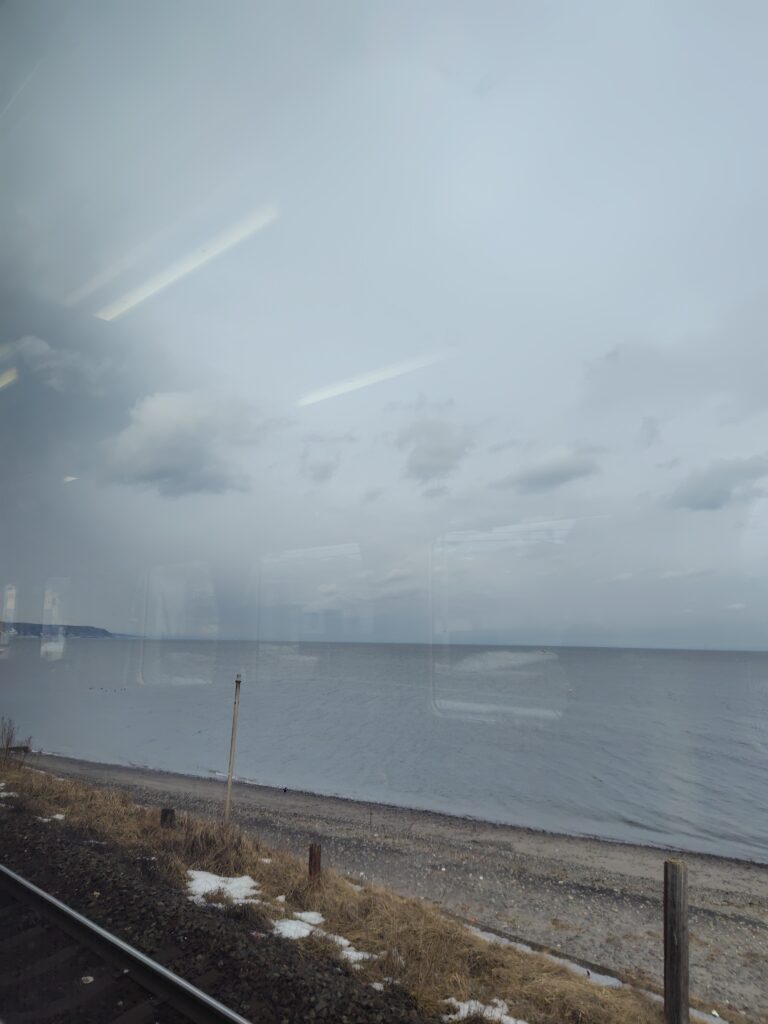途中で、主要駅の森に到着。いかめしが人気の駅で、あとでまた来るのでその時ゆっくり見ます。さて、この森では20分ほど運転停車。両方面からの北斗が行くのを待っての発車です。森から長万部までは、噴火湾に沿うようにして走る、かなり景色の良い路線です。遠くにはうっすらと伊達や室蘭が見えます。