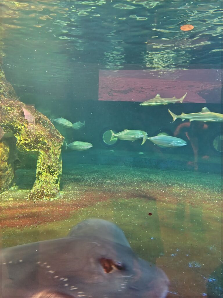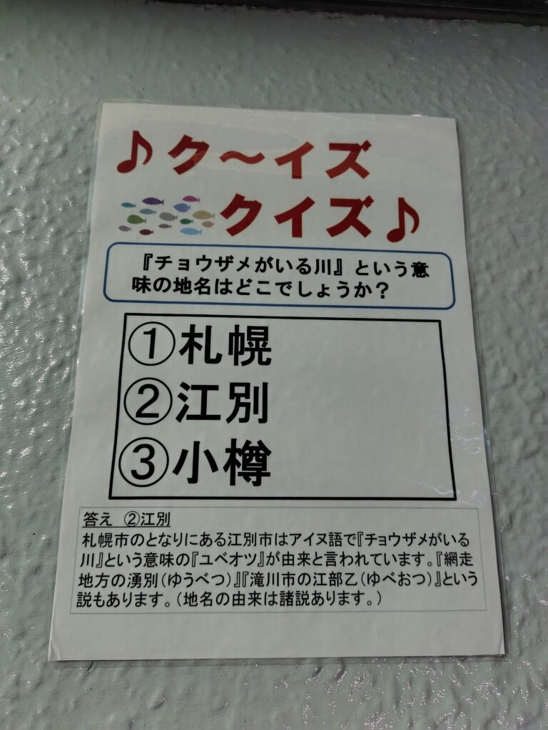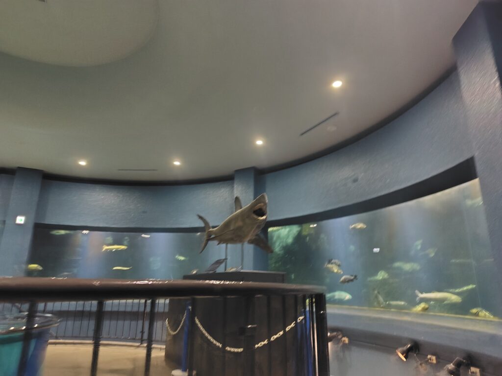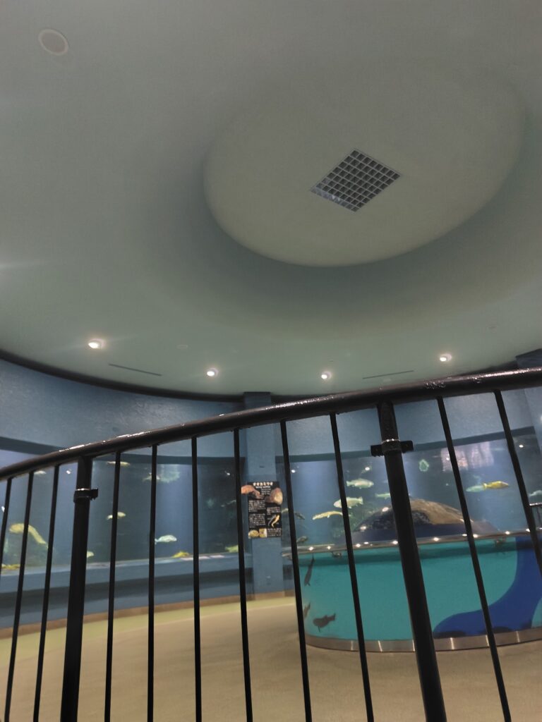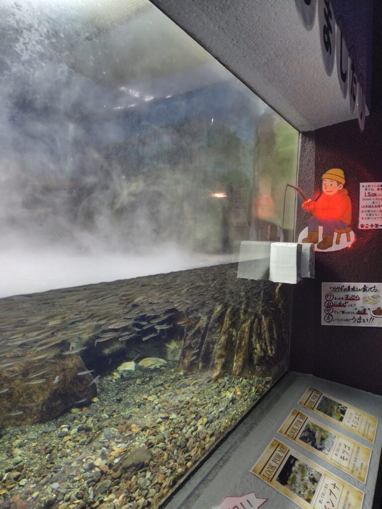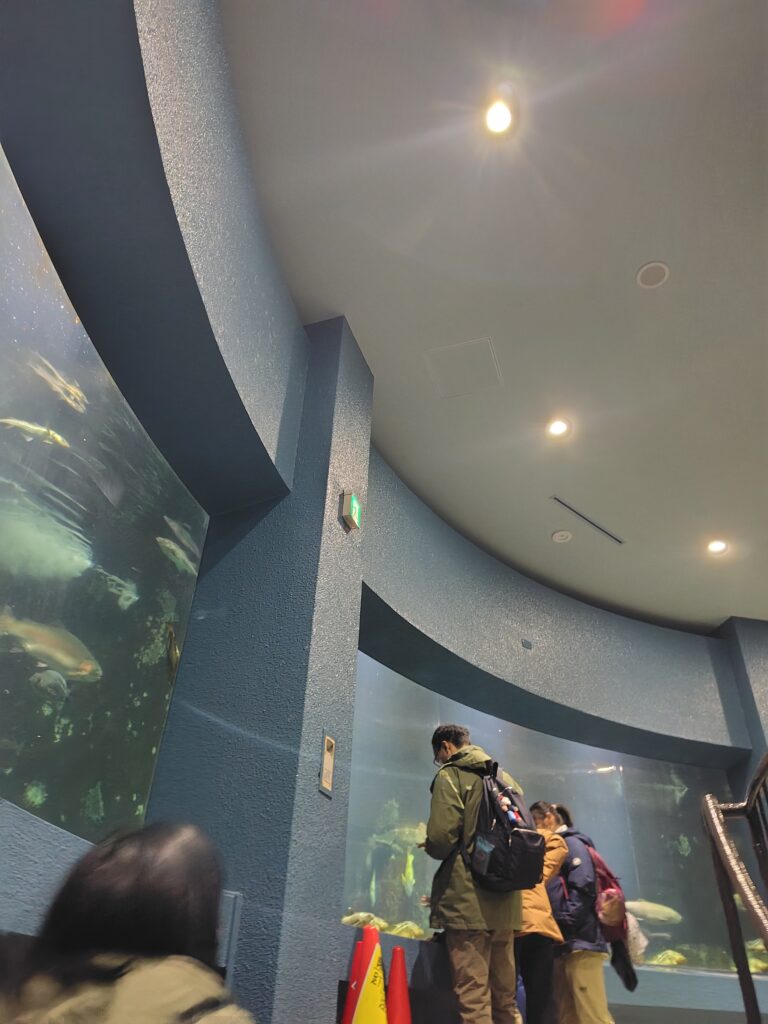 コツメカワウソや熱帯の魚のコーナーを抜けると、オホーツク海とベーリング海の水槽。これも寒い海のコーナー。そして目を見張るのは、円形の水槽。葛西のマグロ水槽のような迫力ある形状で、ニジマスやカレイなどがぐるぐると泳ぎ続けていました。