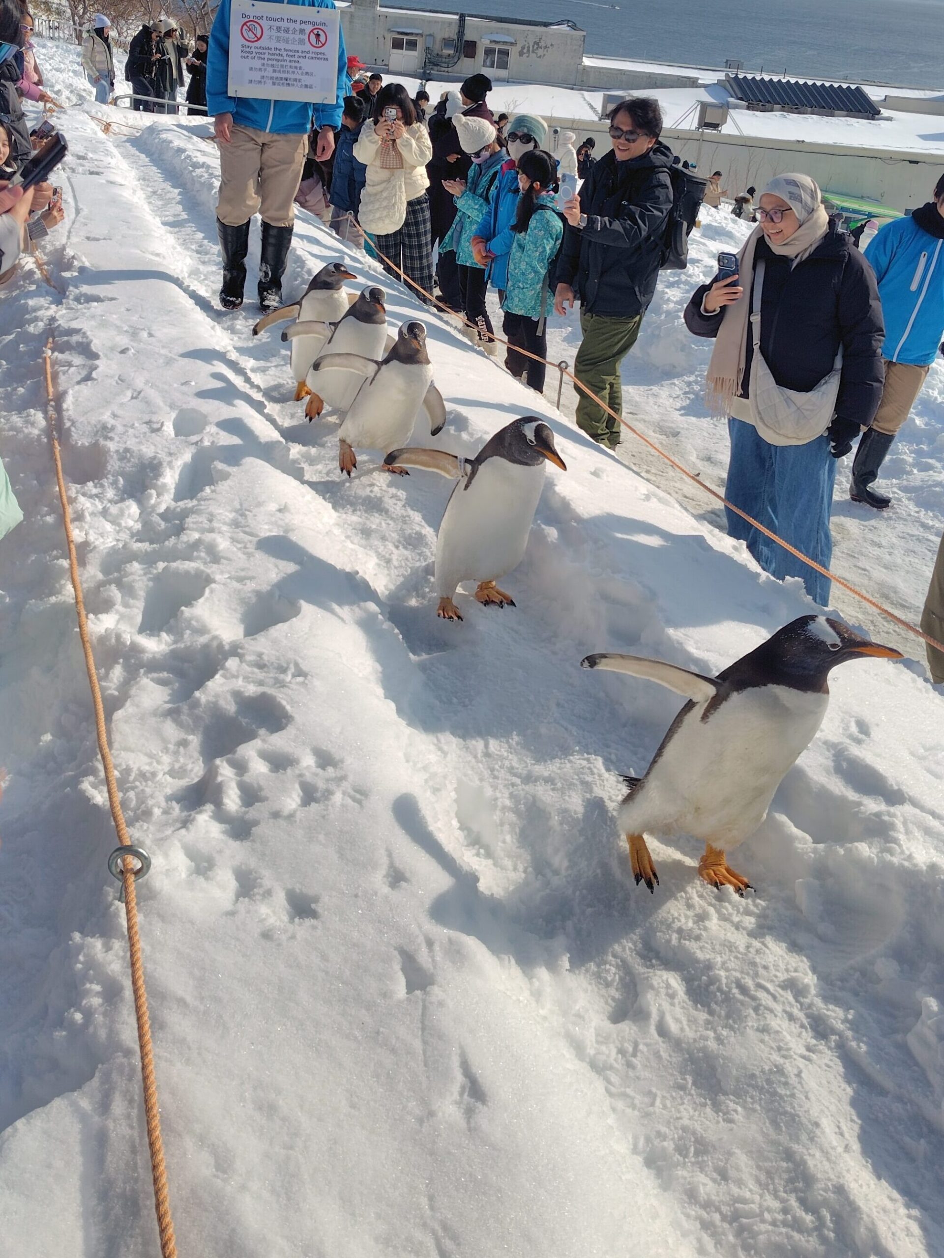 最期に2つほどショーを見ます。オタリアとイルカのショーが11時からで、流れるように11時半からペンギンの散歩があります。オタリアたちについては写真を撮っていなかったのでご自身の目で見てみてください。ペンギンたちは雪で造られた道を飼育員さんに連れられながらよちよちよ歩いていました。こんなに間近でペンギンを見られる機会もそうないので、なかなかに楽しいイベントでした。