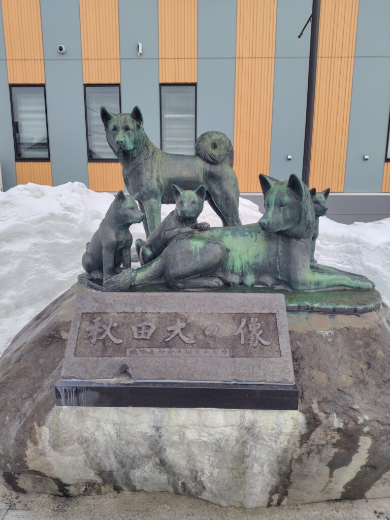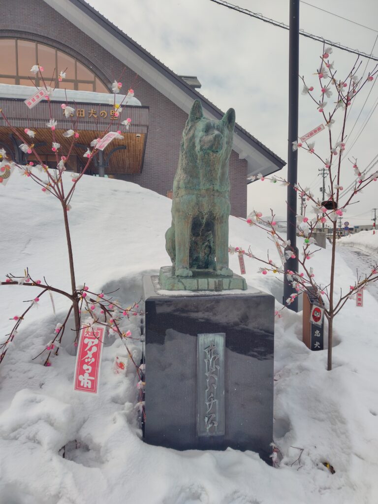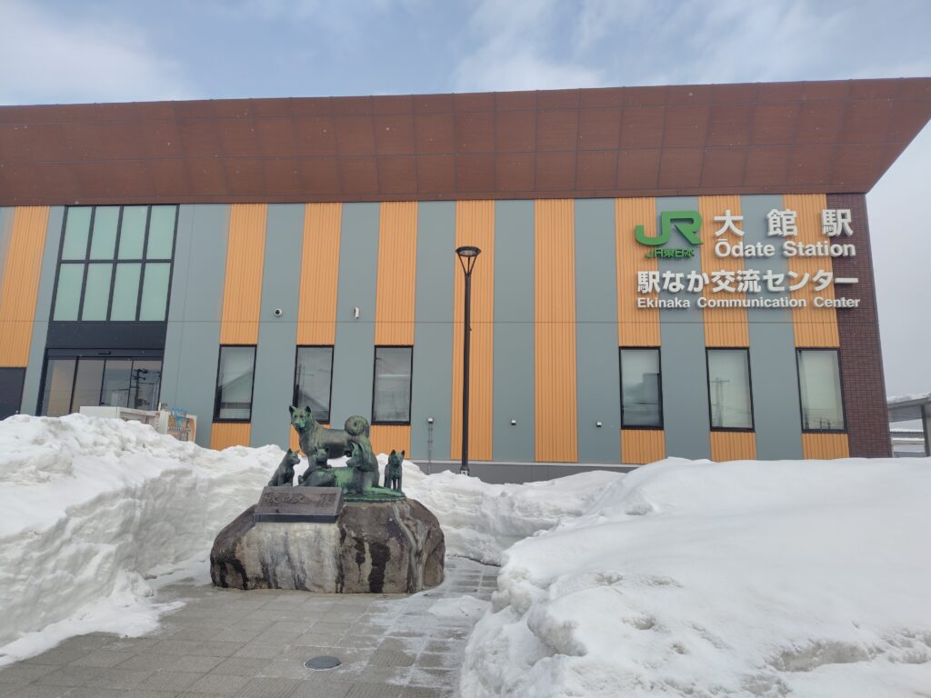 秋田県北部の主要都市・大館市の中心駅で、奥羽本線と花輪線が乗り入れます。秋田犬のふるさととして、駅周辺では多くの犬の像が出迎えてくれます。