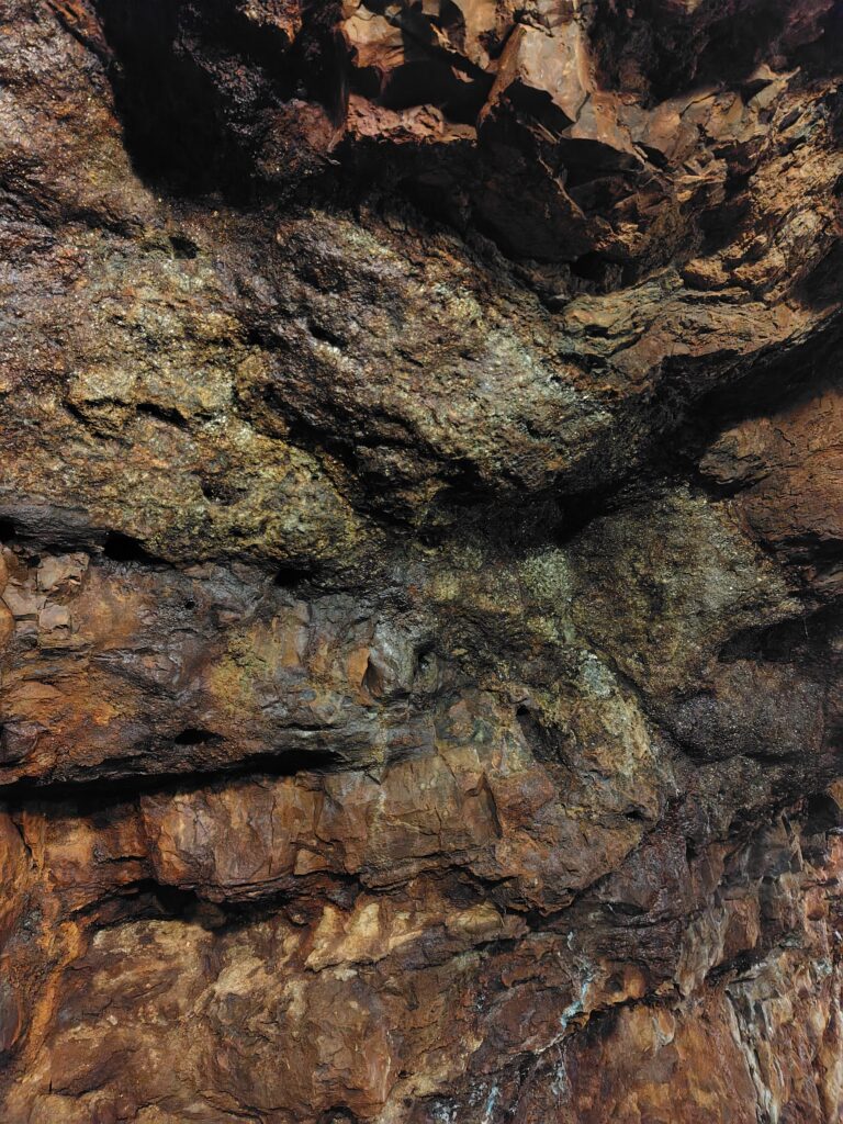 洞窟状のスポットは、直近だと秋芳洞に行きましたが、似た見た目でも内情は全く異なります。こちらは人口のトンネルになるので、トロッコの軌道跡が遺されていたり、木々を積んで屋根を作っていたりと過去の営為が随所に見られます。