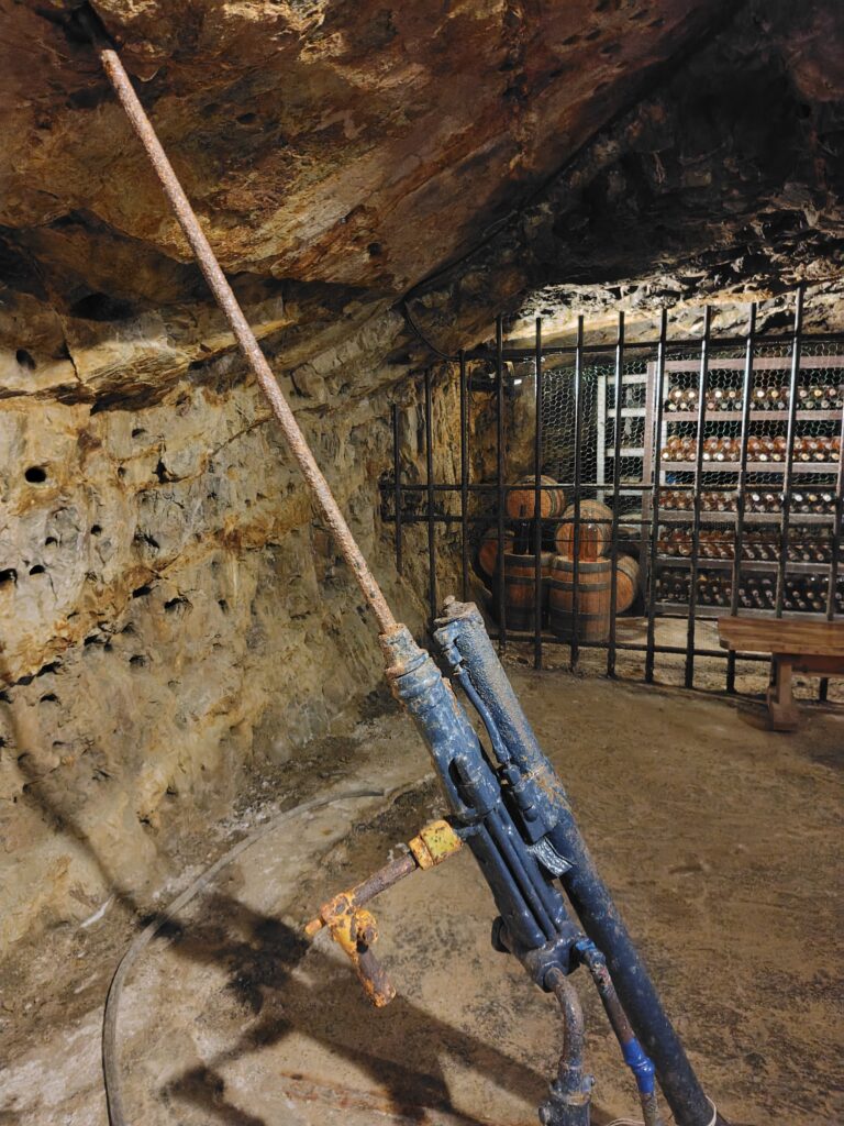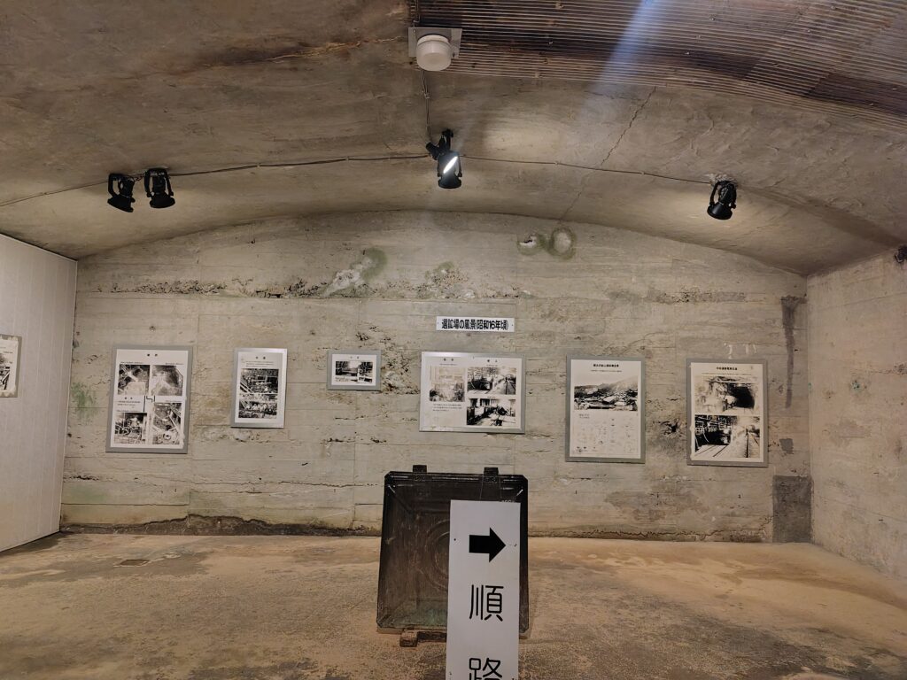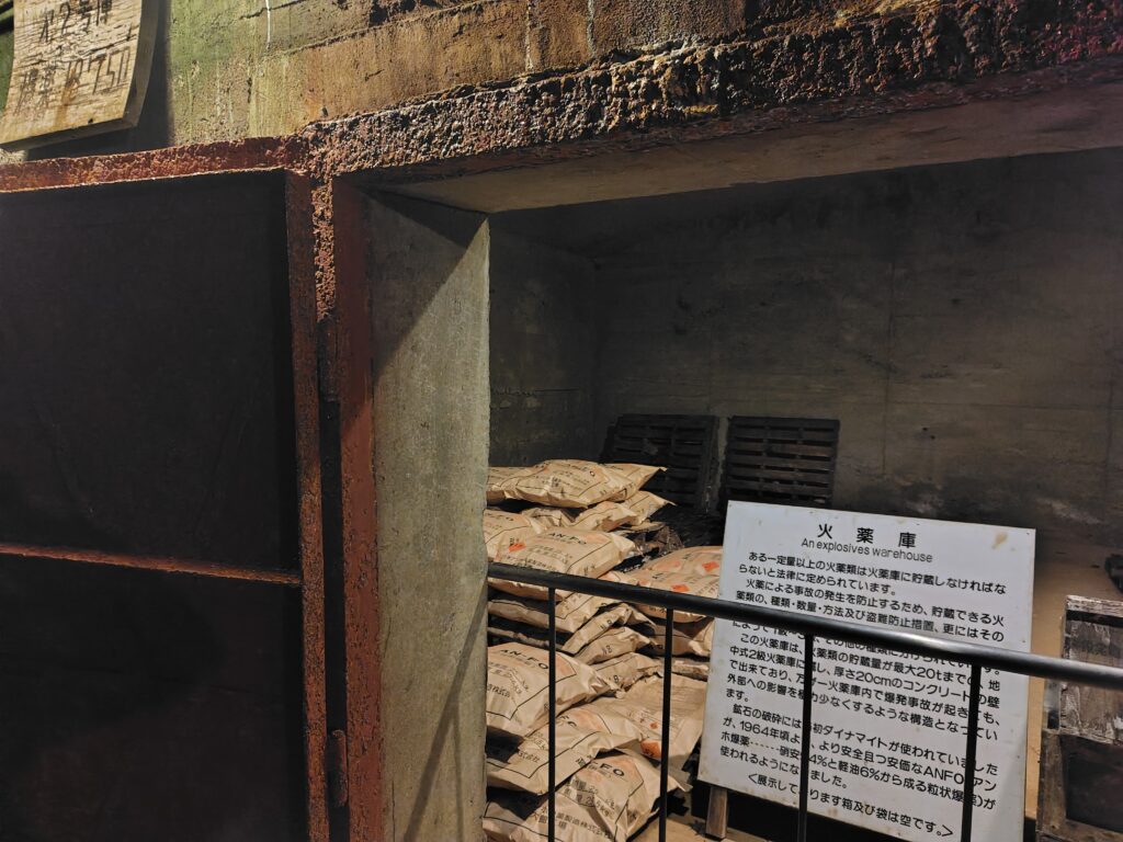 折り返して、徐々に出口に向かっていく構図になります。写真などの資料が手時されたスペースがありました。隣には火薬庫が。このようなものも人口の坑道ならではです。