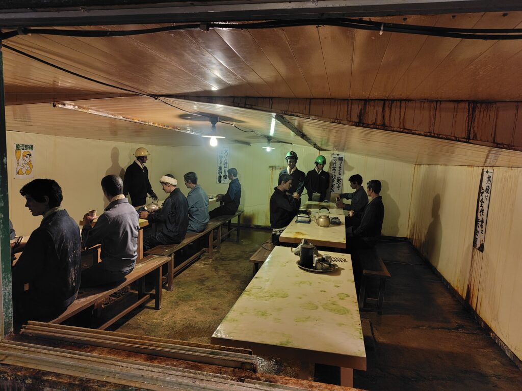 更に進んでいくと、当時の人たちの様子を再現した展示が。誰もいないとなかなか怖い雰囲気もありますが、当時の様子を知るためにはまたとない好機です。看板などにも当時の環境が伝わります。