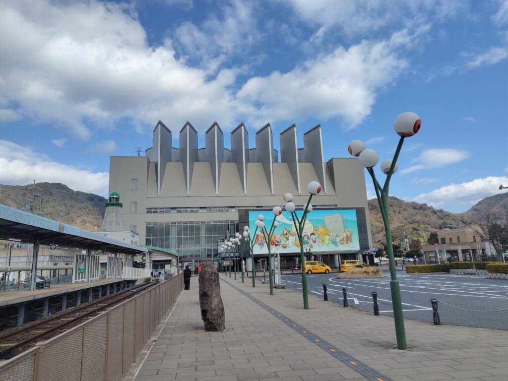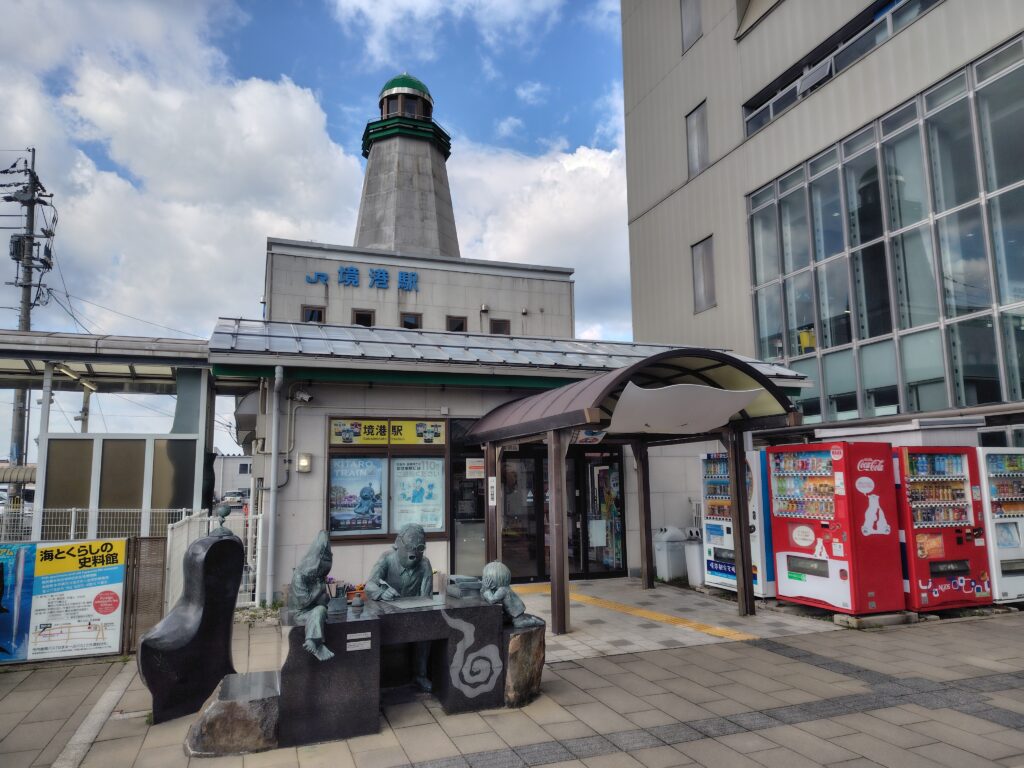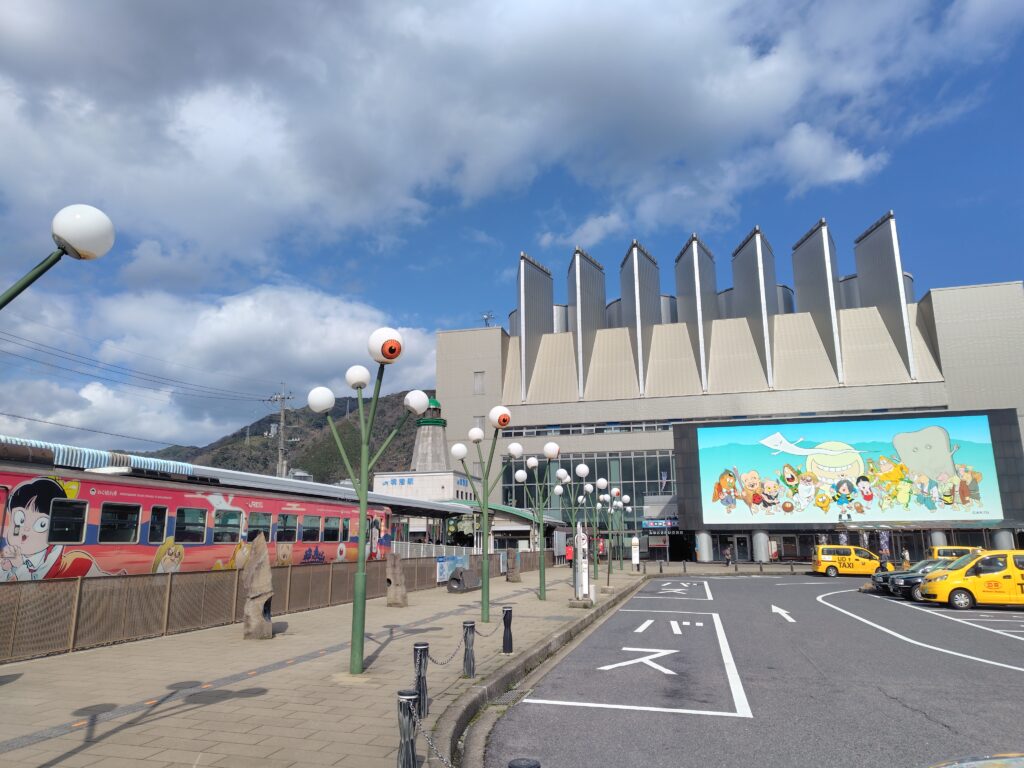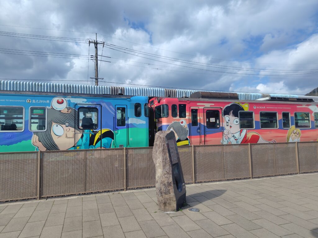 道をひたすら歩くと、境港駅が現れます。境線にもゲゲゲの鬼太郎に登場するキャラクターによるラッピング車両が多く走り、街だけでなく関係するところ全体が町おこしに奮起しているようで、力強さを感じます。